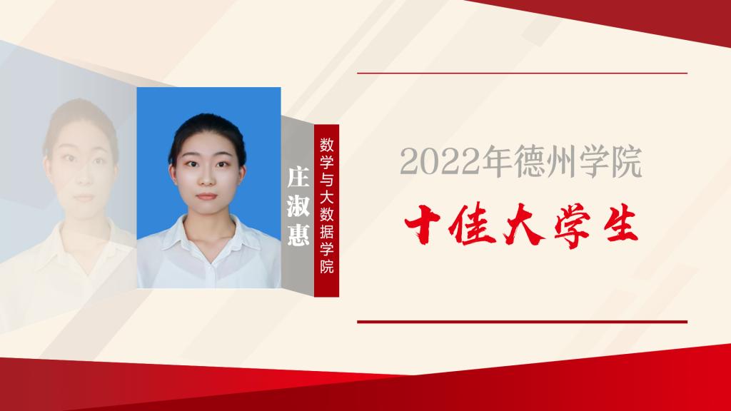 庄淑惠,中共预备党员,数学与大数据学院2019级数学科学与大数据专业学生。自入学以后,庄淑惠全面发展、不断进步,荣获“2022年山东省优秀大学生”;学习上脚踏实地,第二学年的学业成绩与综合成绩均位列全级第一,荣获“优秀大学生奖学金”和“国家奖学金”等;积极搭建知识与应用的桥梁,参加各类竞赛并获“全国大学生数学建模竞赛山东省一等奖”等荣誉证书;身为学生干部,对待工作认真负责,荣获“优秀共青团干部”等荣誉称号;带着去基层工作的愿景,积极组织并参加演讲说活动20余项,热衷于参加志愿活动,累计八余项,超过150个小时,被评为“德州市义工协会支教楷模”。