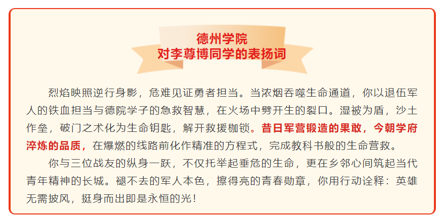 2025年1月30日,山东平度市古岘镇某居民家中突发火灾。面对浓烟翻涌的险境,李尊博协同三名同乡青年迅速反应。凭借部队锤炼的专业素养,他率先冲入火场指挥扑救,用各类容器取水压制明火。当发现距火源仅半米的50L油桶时,他徒手转移至安全区,事后方知桶内满载汽油——稍有延误极可能引发爆炸。“救人如同打仗,时间就是胜利”,谈及抉择,他目光坚毅如炬,坚定地说到:“我是军人,也是新时代大学生,群众遇险,我必须挺身而出。脱下军装,职责仍在;面对危险,冲锋在前。”
