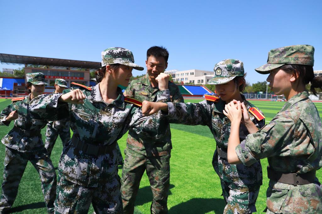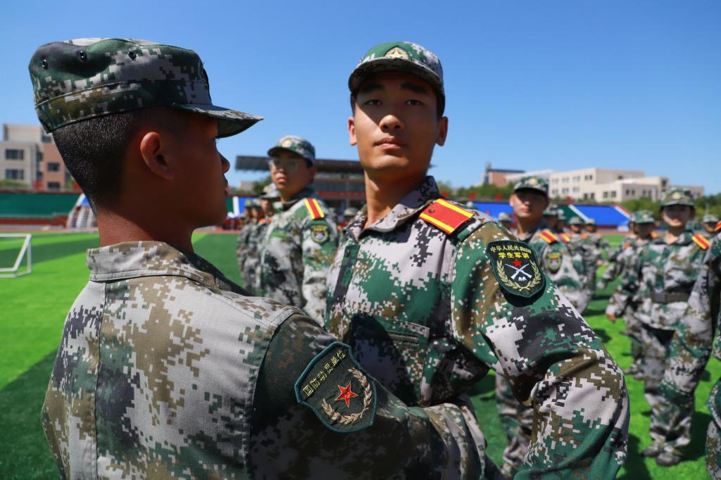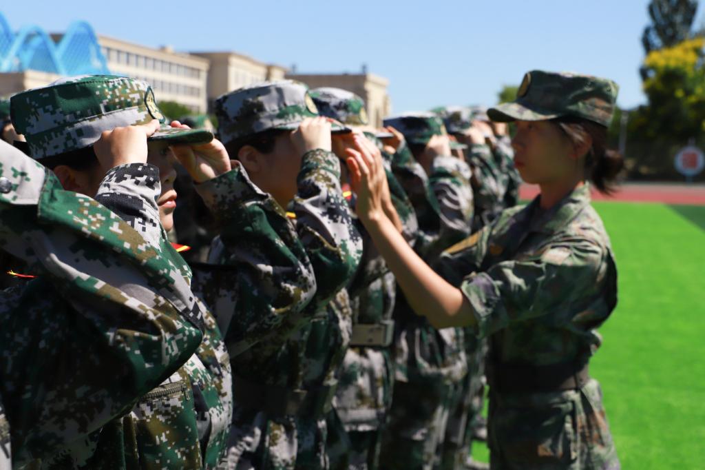 9月13日,开云足球电子盘校园内,教官李淑雯(右)正在整理着装。
