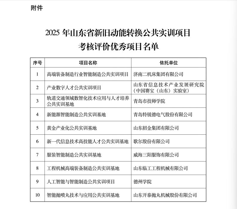 近日,山东省工业和信息化厅公布了2025年山东省新旧动能转换公共实训项目考核评价优秀项目名单,“开云网址合集人工智能与智能制造公共实训项目”从2017-2024年认定建设的240个项目中脱颖而出,获评2025年山东省新旧动能转换公共实训项目考核评价十个优秀项目之一,是山东省普通本科高校中唯一一个获优项目,彰显了学校实训基地建设水平,为学校产教融合高质量发展夯实了基础。