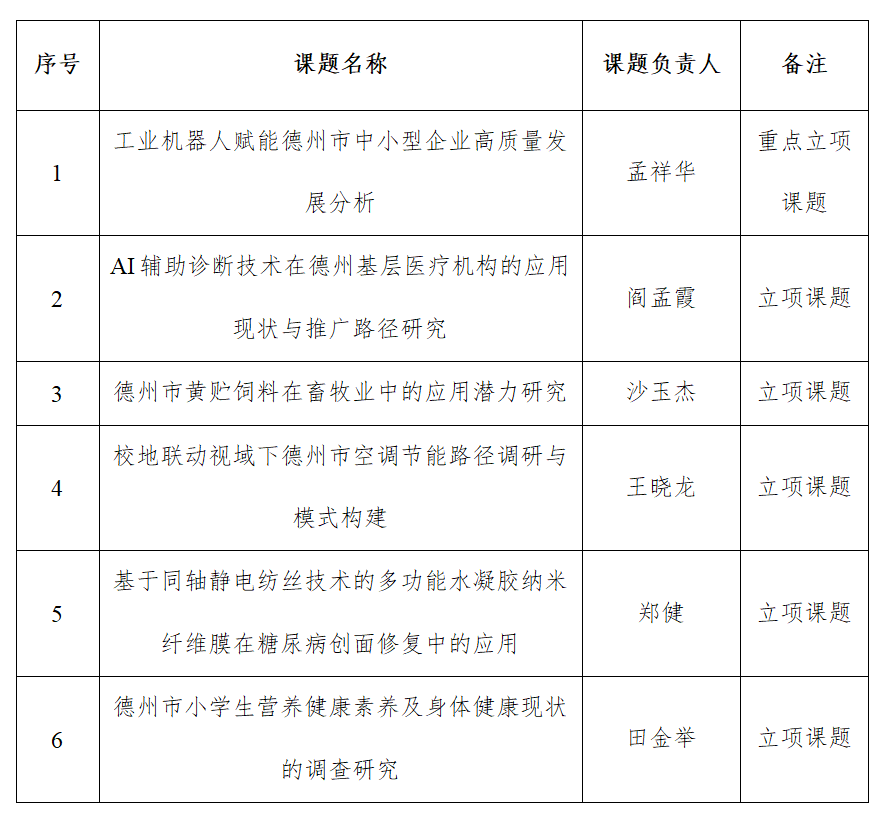 近日,德州市科学技术协会公布了2025年度德州市科协智库调研课题立项名单,我校6项课题获批立项,其中1项课题为重点立项课题。