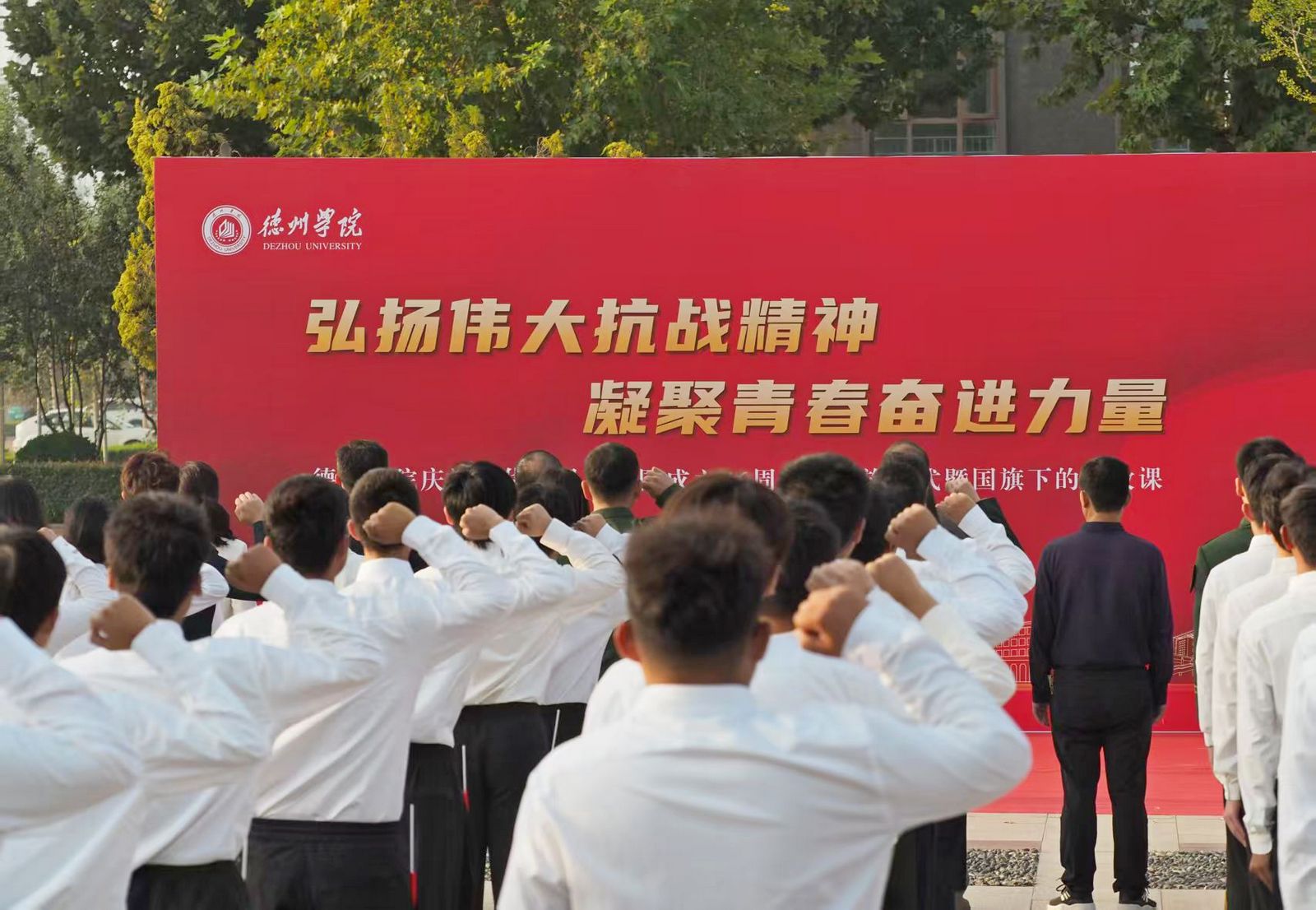 薪火相传砥砺奋进。师生共同学习了《习近平:在纪念中国人民抗日战争暨世界反法西斯战争胜利80周年大会上的讲话》,学生代表深情朗诵《我的青春》,全体学生“青春宣誓”掷地有声,《我和我的祖国》歌声在校园上空回响,充分展现了新时代青年的责任担当,深刻诠释了伟大抗战精神的时代传承,指引广大德院学子以民族复兴为己任,立报国强国大志向,做挺膺担当奋斗者。