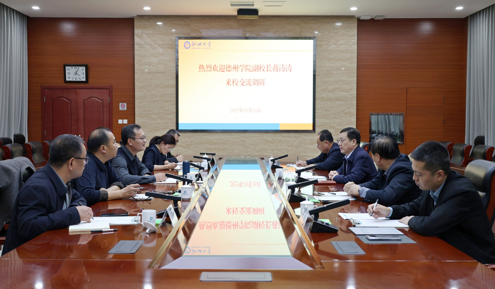 10月16日下午,蒋涛涛一行到聊城大学学习调研,聊城大学党委副书记房增福对学校一行表示欢迎,介绍了学校办学历史、学科建设、科学研究等方面的基本情况,希望双方进一步加强沟通交流,深化务实合作。蒋涛涛对聊城大学的热情接待表示感谢,希望双方在综合治理、学生服务及安全管理、学工信息化、智慧安防、辅导员队伍建设等方面加强交流互鉴,建立更紧密的合作关系,通过资源共享与优势互补,共同推动学校事业和相关工作高质量发展。