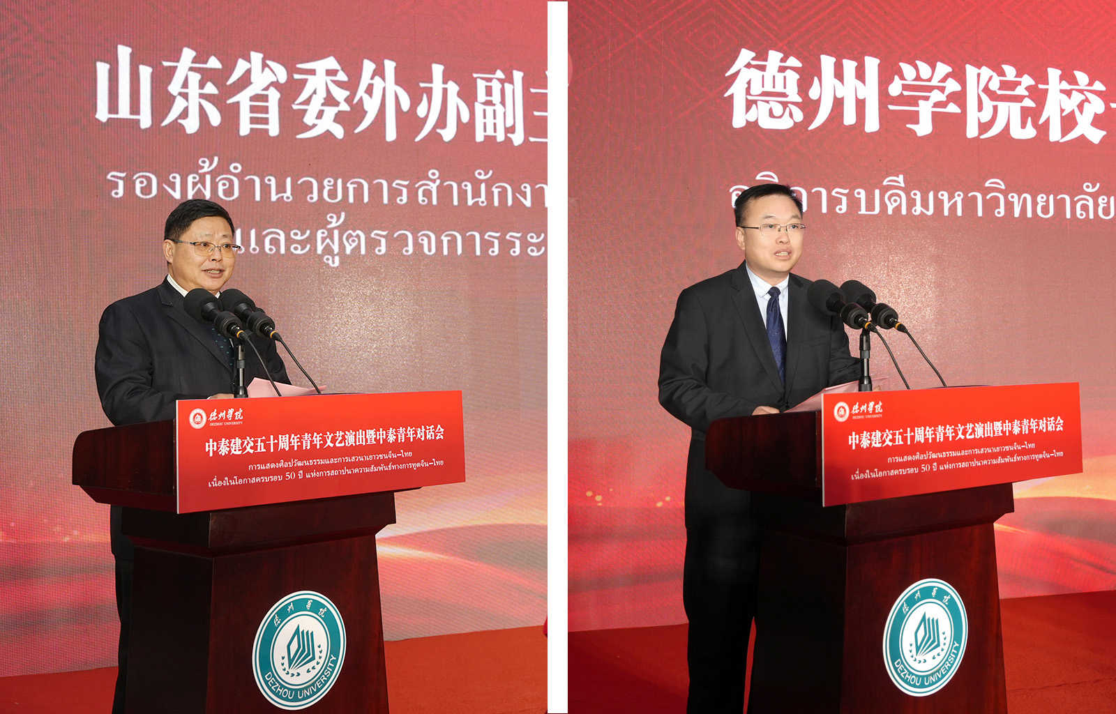 孙业宝在致辞中指出,今年是中泰建交50周年暨“中泰友谊金色50年”,将全力支持高校交流,积极拓展合作领域,期待山东和泰国的青年朋友们担起青年责任,发挥示范作用,带动更广泛的双向交流。赵长林在致辞中指出,中泰友好传承千年,“中泰一家亲”历久弥新,将依托学校“泰国语言文化交流中心泰国角”“东盟研究中心”等平台,深化与泰国高校在学分互认、师生互派、联合培养、科技合作、文化交流等领域的务实合作。他呼吁两国青年增进理解、凝聚共识,成为中泰友谊的传承者与创新合作的推动者。