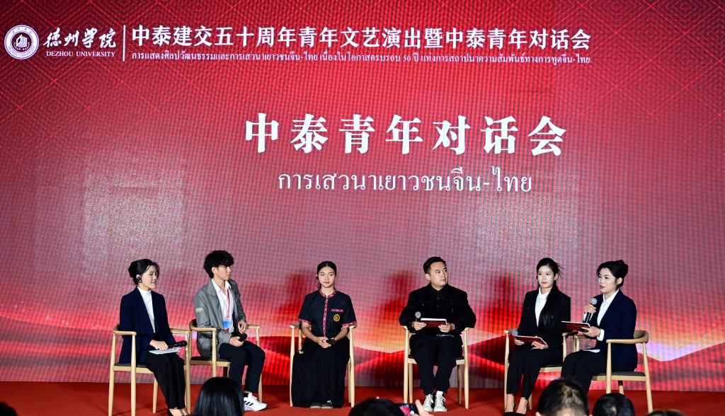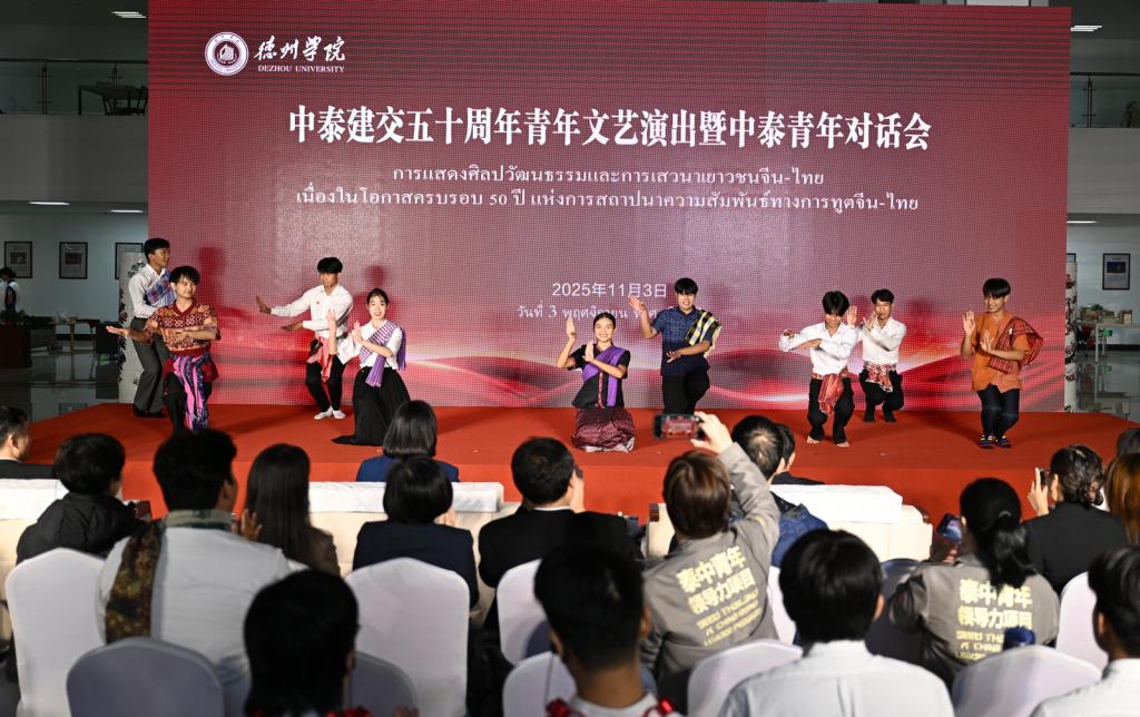 文艺演出节目精彩纷呈,歌曲《只怪相遇太美丽》唱出中泰半个世纪的深情厚谊;舞蹈《摩肯之地的长鼓舞》展现泰国东北部独特风情;武术表演《拳倾四海,谊结千秋》与舞蹈《泰国水灯舞》体现两国文化共鸣;诗朗诵《采桃花》由中泰师生双语演绎,传达诗琳通公主笔下中泰手足情谊。现场还举行泰国知识问答抢答,气氛热烈欢快。泰国青年学生沙哈猜·班丹兴奋地说,“来中国学习交流,深感文化之美,中泰青年表演各具特色,让我领略到不同文化的魅力,此行收获颇丰,回国后定将常忆中国与德州。”