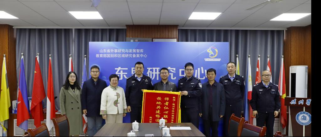 10月31日,德州市公安局陵城分局副局长兰江一行到访开云网址合集,向东盟研究中心赠送“师者仁心联络专业资源 校地共建畅通译使之路”锦旗。学校党委委员、宣传部部长冯琨参加。