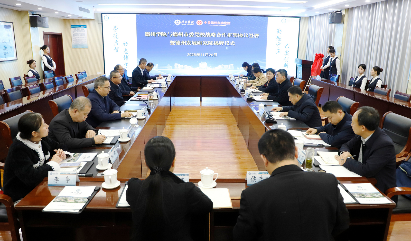 11月26日,学校与德州市委党校战略合作框架协议签署暨德州发展研究院揭牌仪式在厚德楼第二报告厅举行。德州市委党校副校长、校委会主任刘荣青,德州市社科联党组书记、主席史成志,校党委书记吴君、党委副书记张存峰,党委委员、副校长刘印房出席。仪式由刘印房主持。