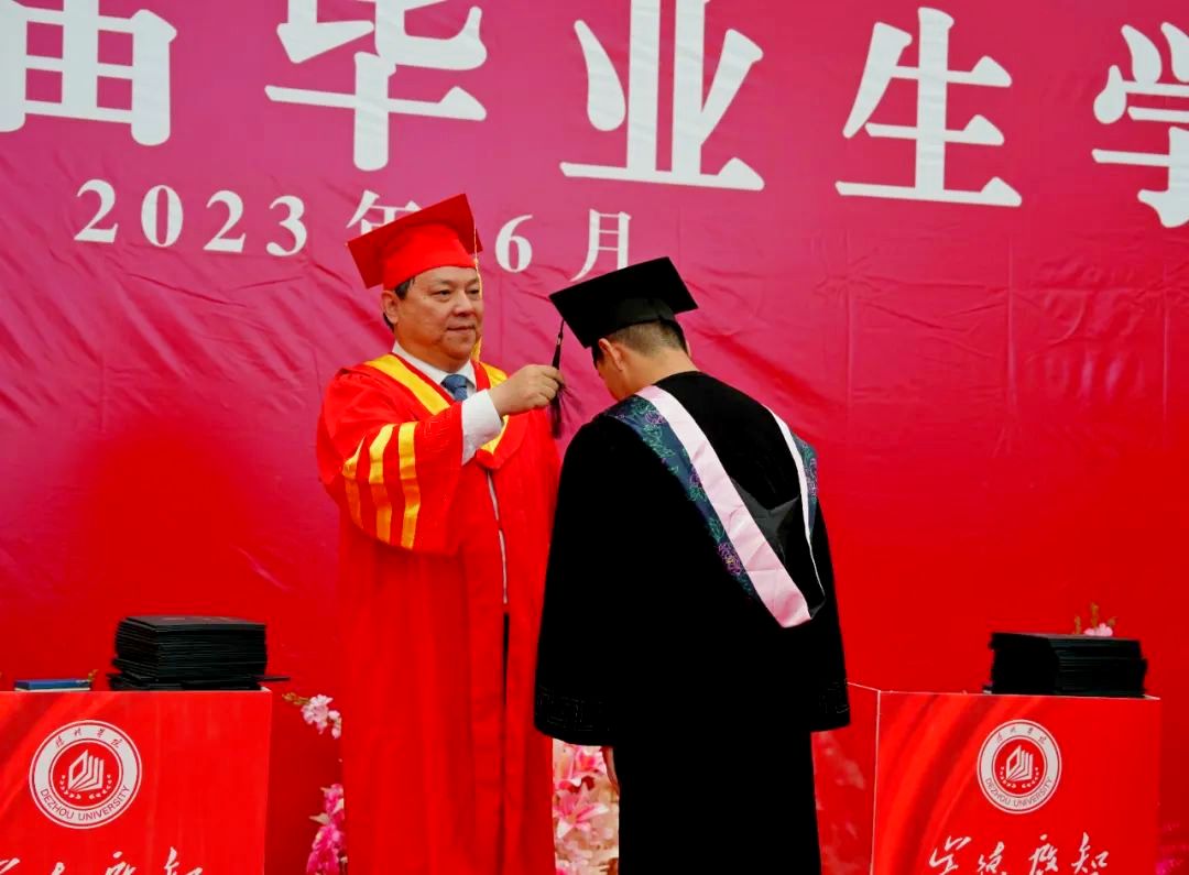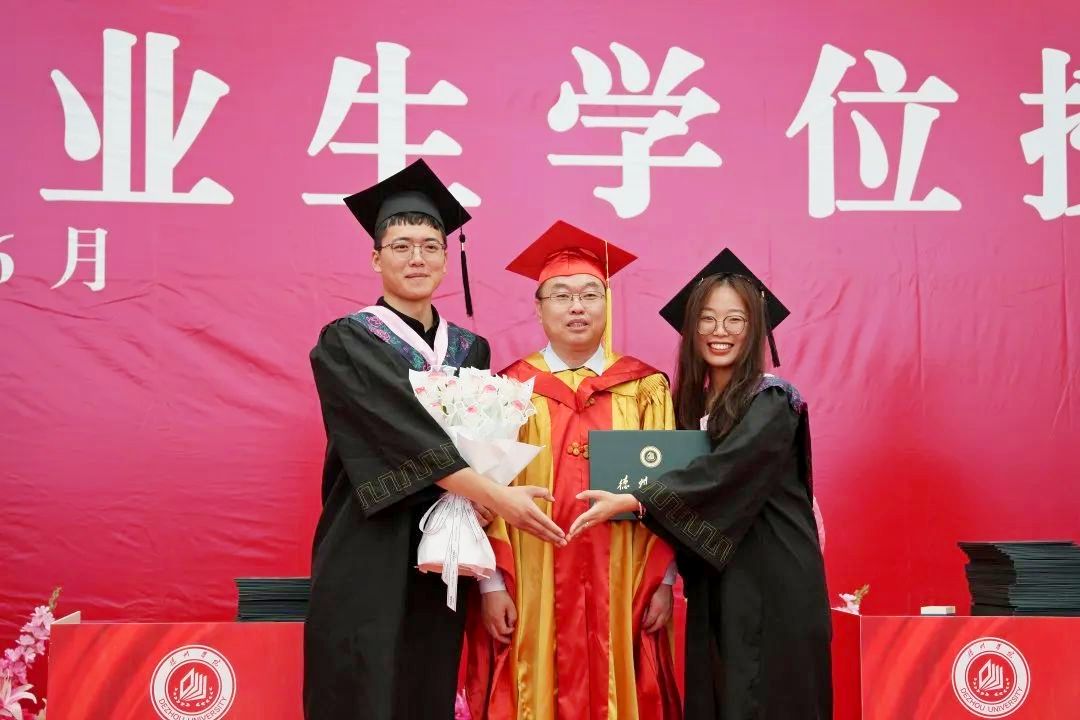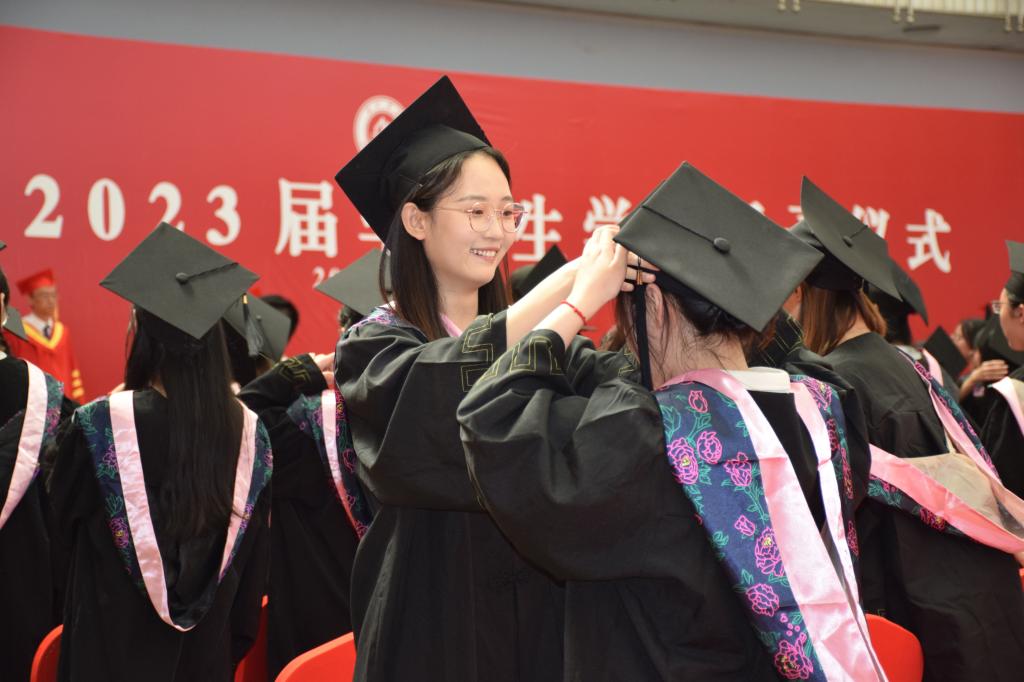 学位授予仪式上,校领导为毕业生代表逐一拨穗正冠,颁发学位证书并合影留念。