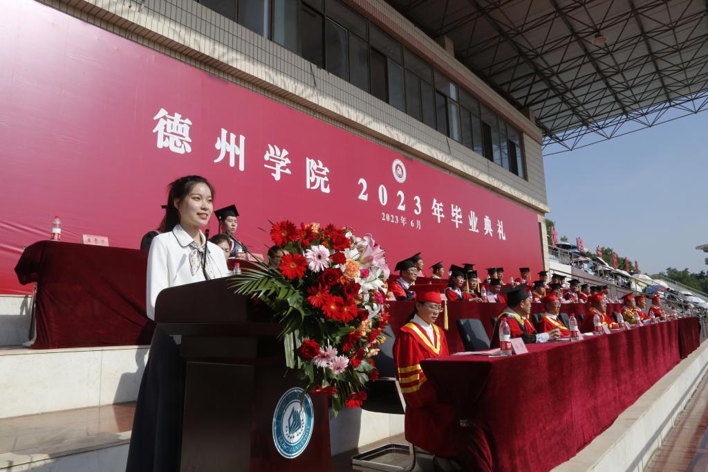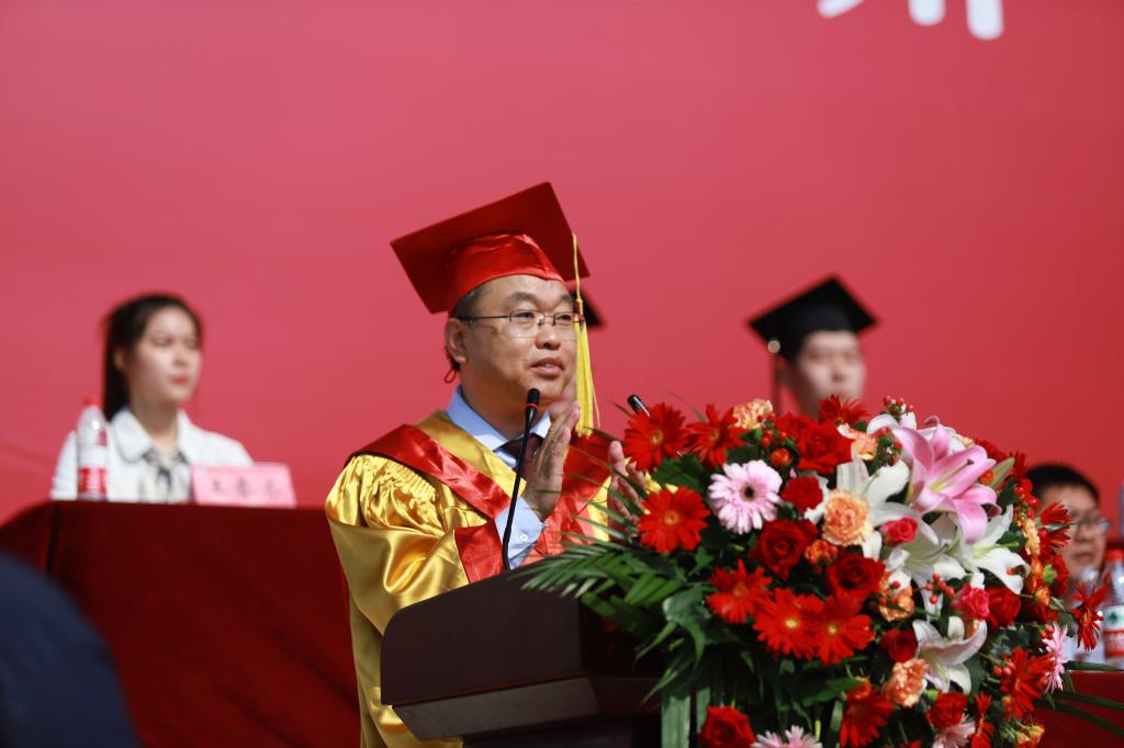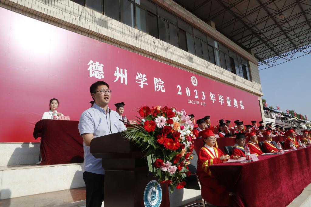 毕业典礼上,赵长林致辞。他首先对2023届毕业生顺利毕业表示祝贺,向为学生成长成才辛勤付出的老师、广大教职员工和学生家长,致以崇高的敬意和衷心的感谢。他说,岁月如歌、光阴飞逝,美好的求学时光转瞬成为难忘的青春回忆。四年的大学时光你们用自己奋斗的青春,深刻诠释了“崇德启智、励志博学”校训,用自己的行动践行了“艰苦奋斗,自强不息”的德院精神,德院正是因为拥有、汇集了一代代学子的亮丽青春,才会永葆青春,事业日新。