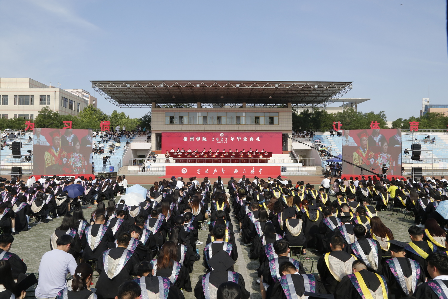 夏至已至,美好始长。6月21日上午,学校2023届毕业生毕业典礼暨学位授予仪式在体育场隆重举行。7916名毕业生带着全校师生的美好祝愿与期盼即将踏上新的征程。校领导班子成员车滨、赵长林、王金利、张明征、迟沂军、张存峰、徐静、崔新乐、任立春,校学术委员会主席王明友出席毕业典礼。徐静主持毕业典礼。