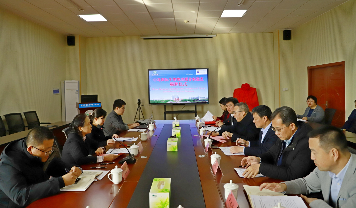 11月13日,中马国际生物物理联合实验室揭牌仪式在生物物理研究院举行。马来西亚马来亚大学专家陈盈朱一行,德城区政府党组成员、副区长杜海伟,我校党委委员、副校长刘印房、李甲亮出席仪式。仪式由李甲亮主持。