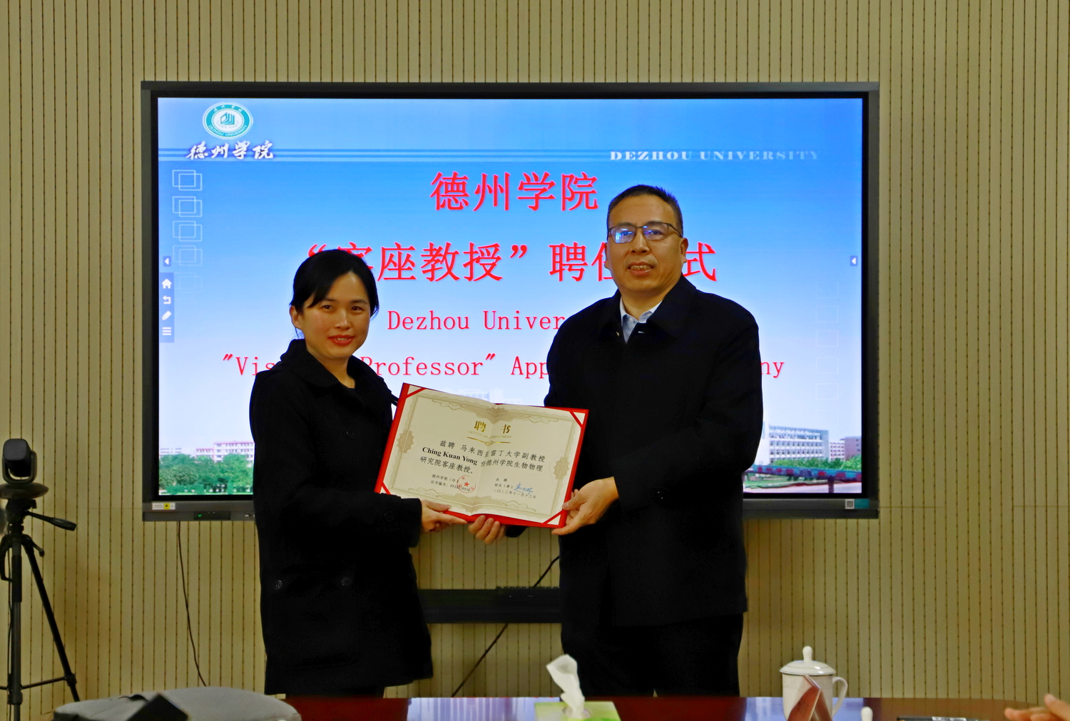 李甲亮宣读了客座教授聘任决定,刘印房分别为马来西亚专家蔡清福、陈盈朱、陈观蓉颁发了客座教授聘书。