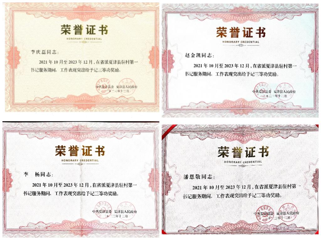 2021年10月,我校选派4名同志赴夏津县郑保屯镇担任“第一书记”抓党建促乡村振兴。两年多来,他们在驻地党委、政府正确领导下,依靠帮扶村党员、群众,紧扣职责任务,投身乡村振兴,出实招、办实事、惠民生,在帮扶村新冠疫情防控、人居环境改善、产业项目建设、提升村民收入、农田水利工程、村内道路硬化等方面,用真情和汗水书写了满意答卷,赢得了驻地党委政府充分肯定和群众的普遍认可。4名“第一书记”在省委组织部组织的2023年年度考核中均被评定为“优秀”。其中,赵金凯同志所在的八屯村2023年村集体收入达70万元,入选“全省强村富民先进典型”,被评为“夏津县先进党支部”;赵金凯同志被授予夏津县“先进个人”荣誉称号,被聘为德州市“乡村振兴金融专员”并荣立三等功。