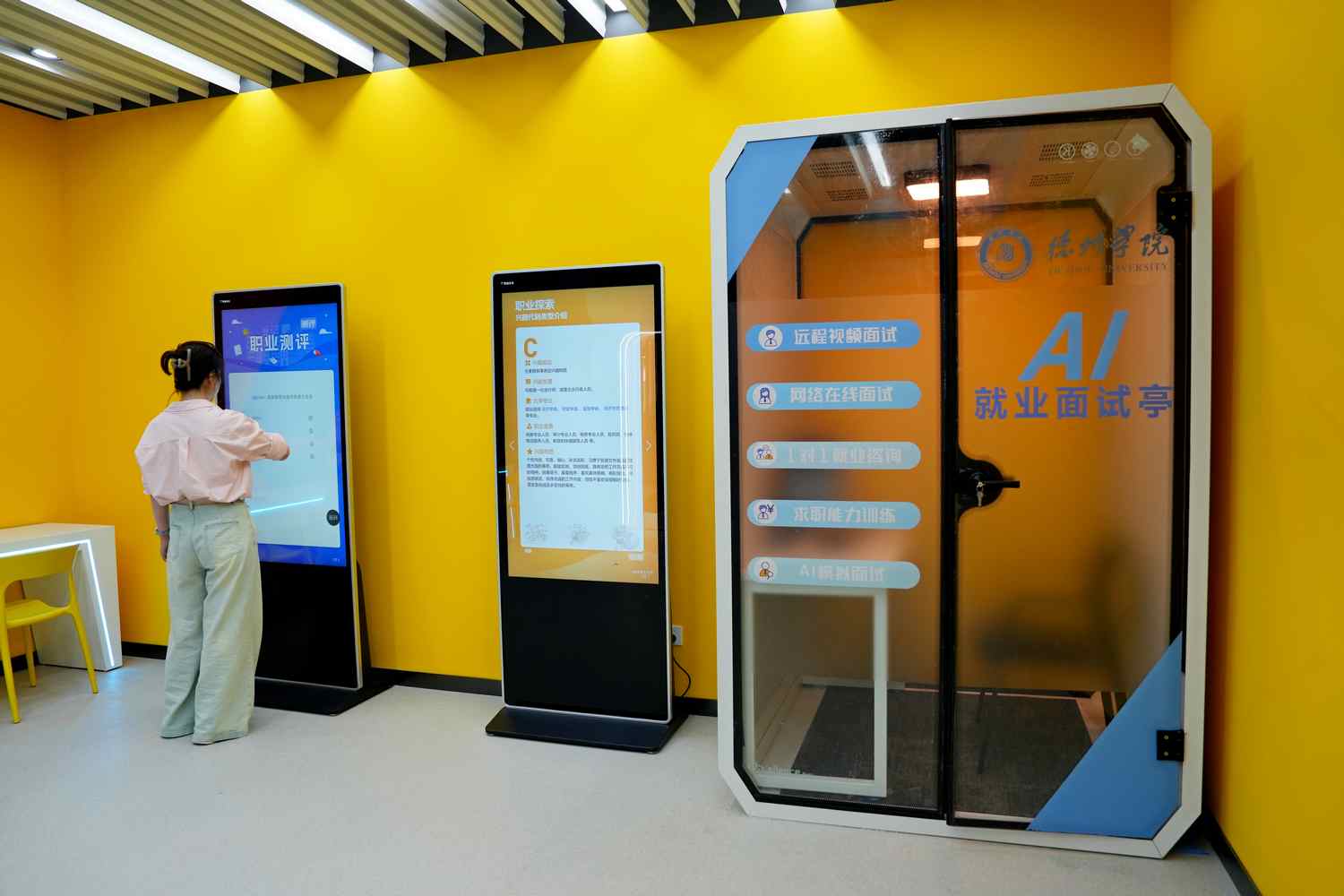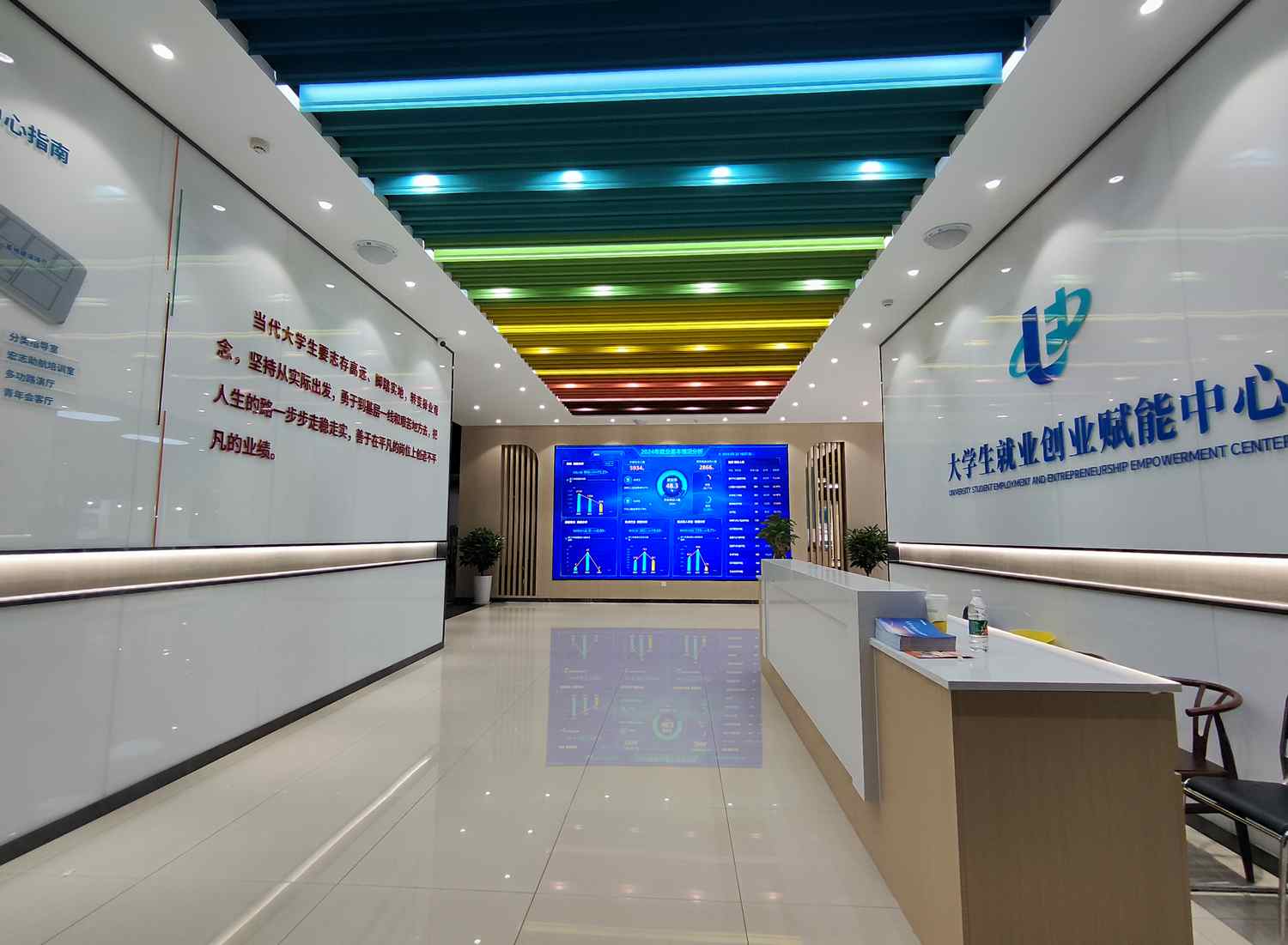项目按照省人社厅、教育厅、财政厅关于创建大学生就业创业赋能中心的实施意见,紧紧围绕学校应用型办学定位和学科专业特点,坚持因地制宜、依托现有条件,合理确定建设规模和建设特色,确保创建工作有质有效。目前,赋能中心主要包括接待大厅、就业信息展示区、生涯互动探索区、AI就业指导区、分类指导工作室、就业指导教研室、企业招聘室、面试训练室(直播带岗间)、宏志助航培训区、青年会客厅、多功能路演厅、24小时自习室、共享阅读区、就业咖啡吧、就业心理指导室、职业指导名师工作室、文创展示区等区域,提供生涯与职业规划教育、生涯测评、生涯档案、一生一策、精准推送、就业指导、就业画像、AI简历制作、AI模拟面试、大数据展示管理等服务。