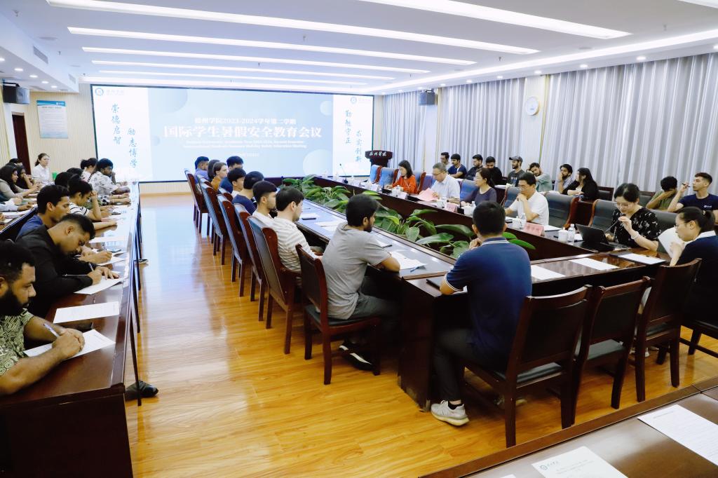 刘印房对本学期留学生培养和管理工作给予了充分肯定。他说,国际学生的安全是平安校园建设的重要一环,希望全体留学生持续增强遵规守矩及安全防范意识,自觉遵守法律法规和校纪校规,自觉维护自身和学校的良好形象。要养成科学合理的生活习惯,增强体育锻炼,时刻把自己的健康放在首位。要妥善规划暑假生活,查漏补缺,巩固专业知识,度过一个平安愉快,充实有收获的假期。刘印房要求,各部门、各学院要强化思想认识,各司其职,密切配合,构建科学完善的留学生安全管理应急处置和保障机制,形成留学生安全管理的有效合力。要树立“以人为本”的理念,完善规章制度,促进管理能力的提升,有计划地开展留学生管理人员的涉外法律知识培训,适应新形势下不断变化的留学生安全管理的需要。