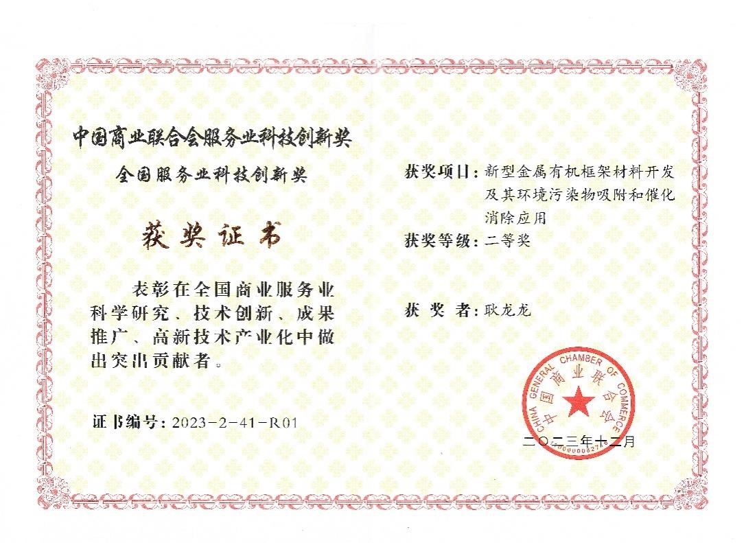 7月21日,中国商业联合会主办的2024年全国商业科技质量大会在北京召开。由我校牵头完成的研究成果“新型金属有机框架材料开发及其环境污染物吸附和催化消除应用”荣获中国商业联合会服务业科技创新奖二等奖,省高校先进材料与绿色催化青创团队负责人、化学化工学院耿龙龙副教授为第一完成人。