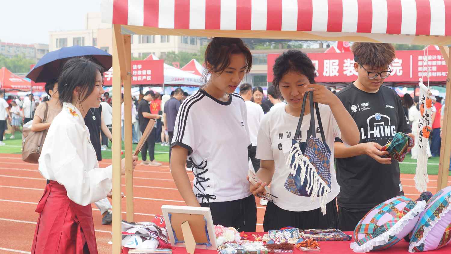 纺织服装学院:专业育人,美育浸润,提供“一站式”贴心服务。设计“一见倾‘新’共赴韶华”迎新展板,展示鲁锦手工创意作品,志愿者身着马面裙向新生和家长介绍专业特色,新生专业启蒙“第一课”形象生动。