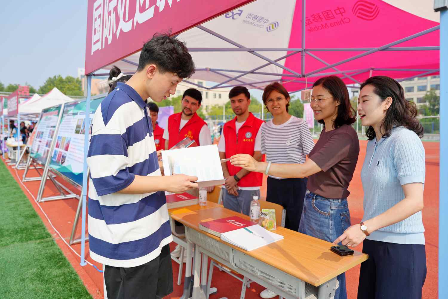 国际教育学院:分享国际交流合作项目、留学政策,发放国际交流宣传资料,对咨询的新生和家长进行详细的解答,帮助学生开阔国际化视野,营造浓厚的校园国际化氛围。