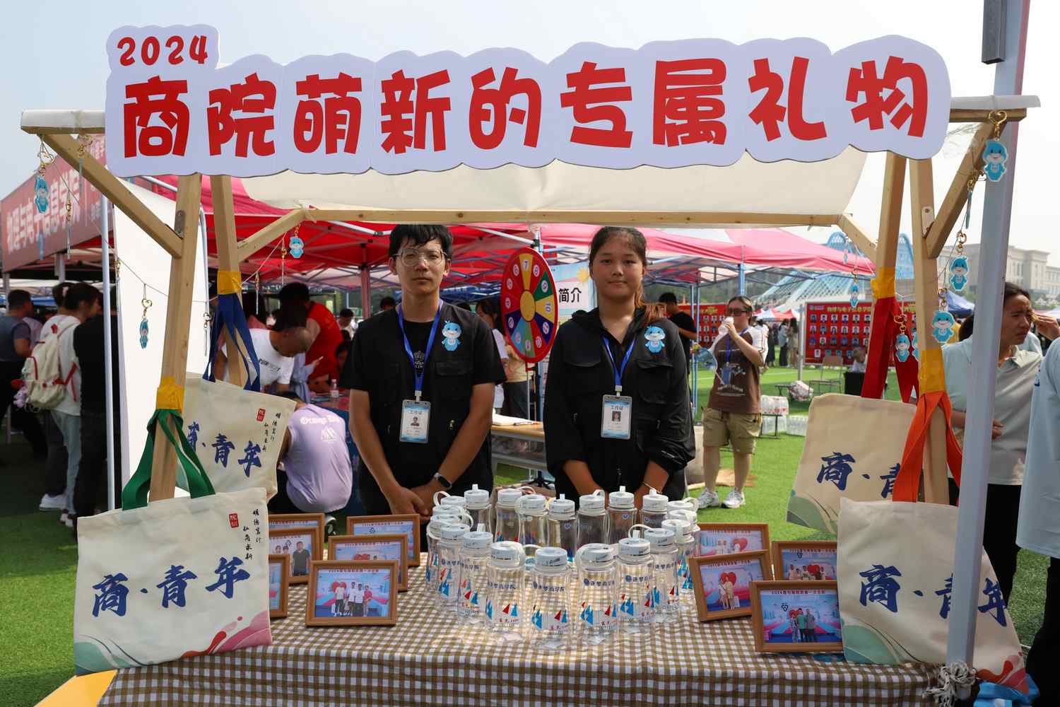 外国语学院:文化板设计以蓝色为主色调,突出学院定位、人才培养理念,融合中文、英文、俄语、日语等多语种文化,定制文创帆布包、留言签名框,让新生更好地融入外院大家庭。