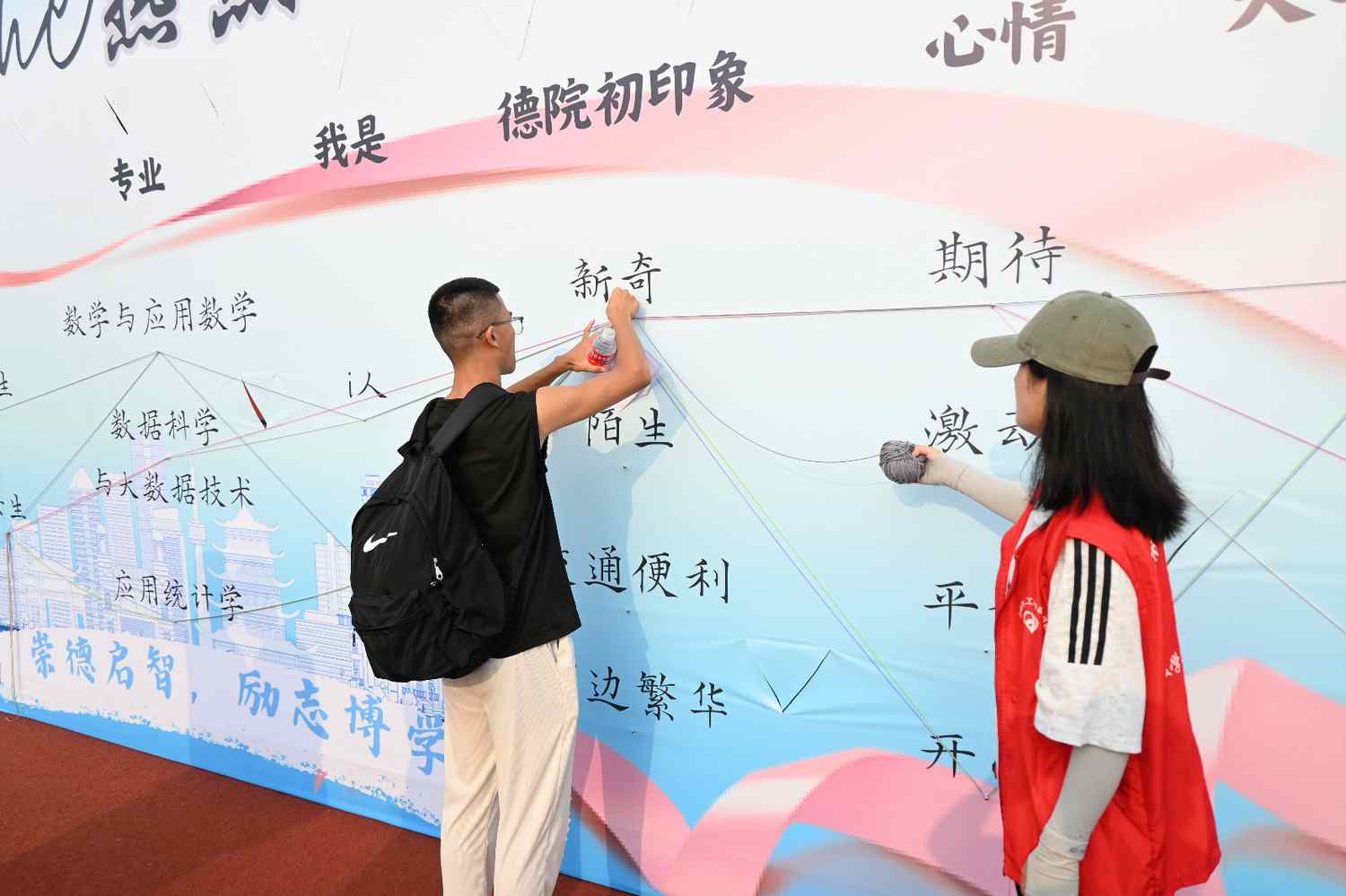 数学与大数据学院:“以学生为主体”将专业教育与迎新合体,凸显学院文化内涵和特色;开展家长课堂,营造家校共育氛围。宣传展板设置家乡打卡点和绕线活动,对新生的性格、专业、心情等进行多样化的展示。