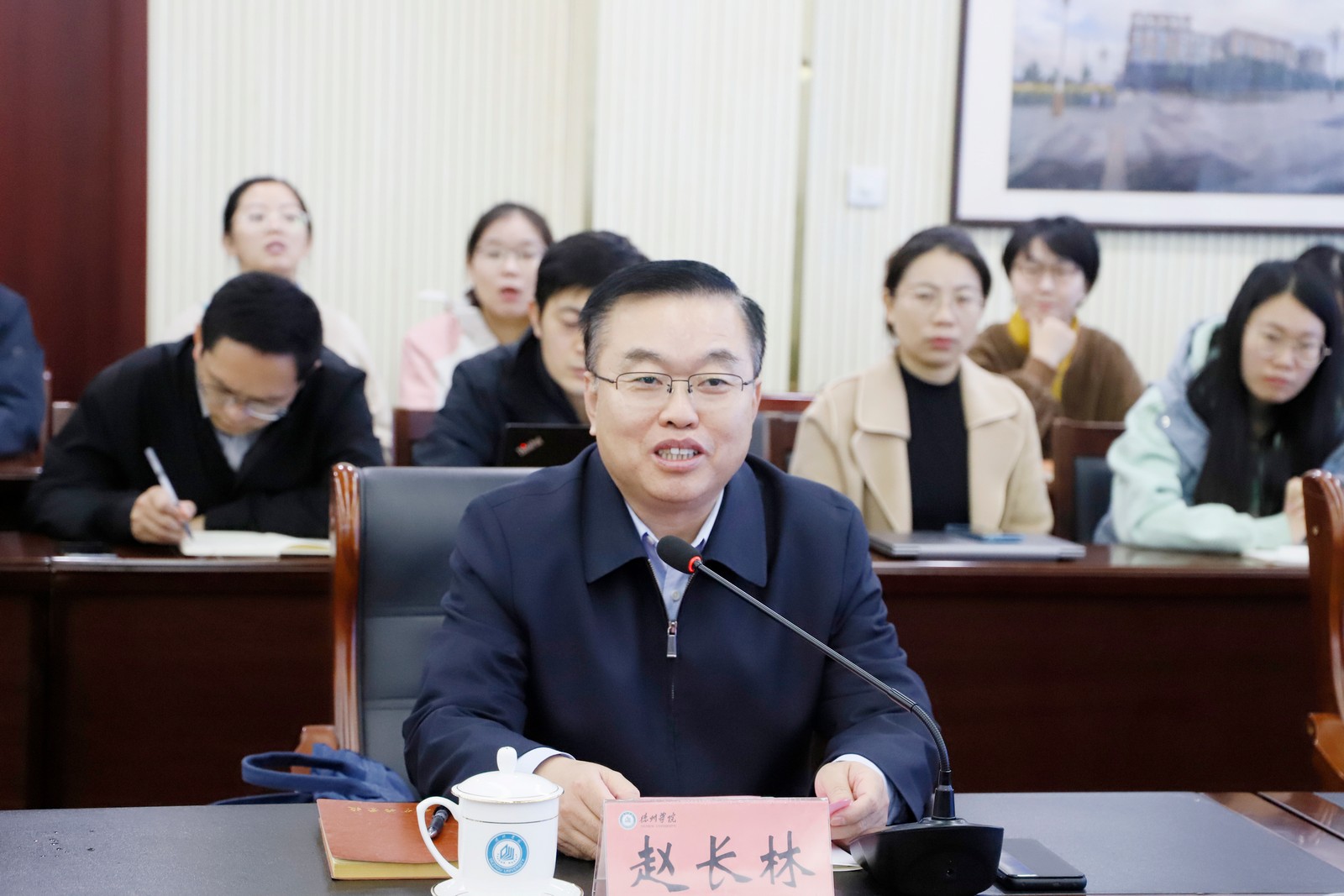 赵长林致辞,欢迎岳远征来校指导工作,对岳远征长期以来关心和支持学校事业发展表示感谢。他介绍了学校办学历史、办学定位、办学成绩及规划目标等总体情况,希望岳远征能继续关注和支持学校发展,共同续写学校建设发展新篇章。并为岳远征颁发“开云网址合集名誉教授”聘书。