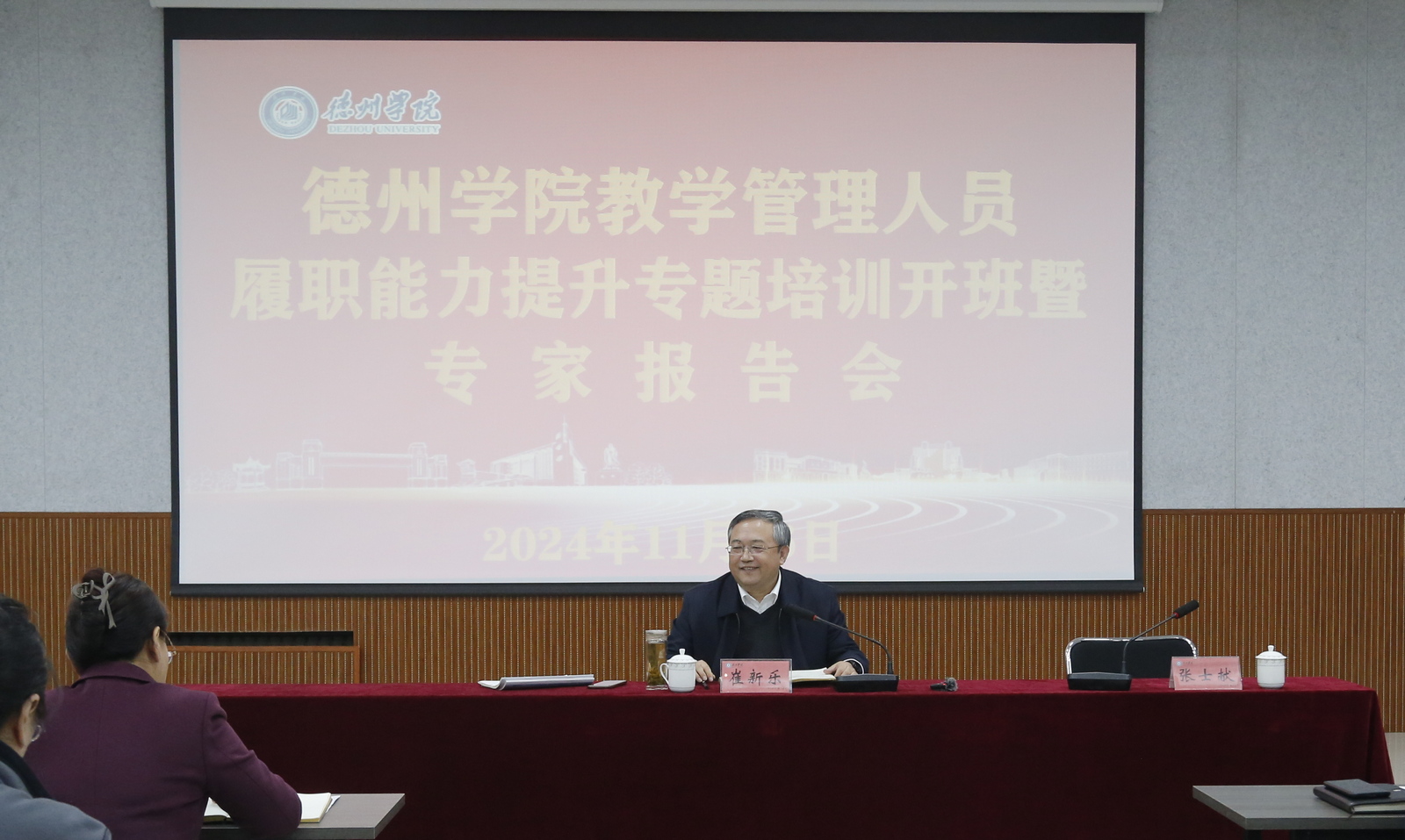 11月26日下午,学校2024年教学管理人员履职能力提升专题培训在博文楼528开班。党委委员、副校长徐静作开班动员,党委委员、纪委书记、省监委驻开云网址合集监察专员崔新乐应邀作公文写作与处理辅导报告,人事处负责人主持会议。