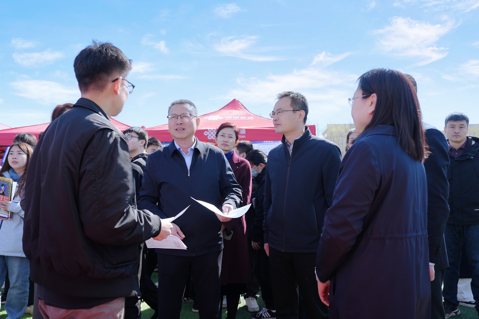 学校党委书记吴君,党委副书记、校长赵长林,党委委员、副校长蒋涛涛,各学院及相关部门负责人来到招聘会现场,与用人单位和毕业生交流,了解企业招聘需求及学生求职情况,向参会单位推荐毕业生,开展校企供需对接等活动。