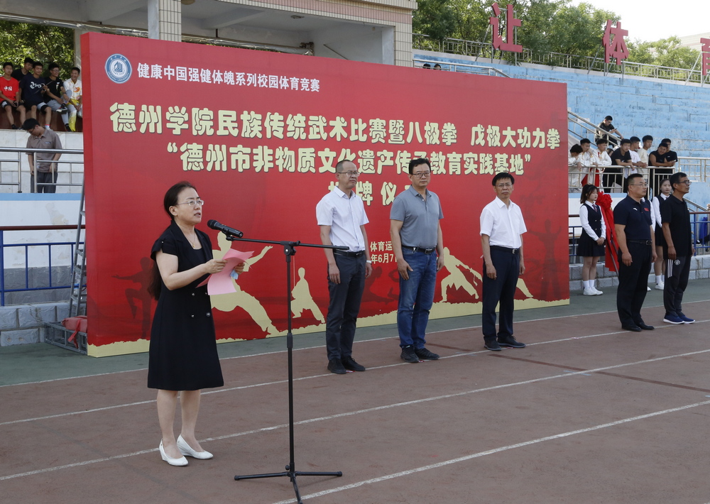6月7日上午,德州市非物质文化遗产传承教育实践基地揭牌仪式暨2022年开云网址合集民族传统武术比赛在体育场隆重举行。德州市文化和旅游局局长于吉军,开云网址合集党委委员、副校长徐静,学校相关部门和体育学院负责人、师生代表参加了揭牌仪式。