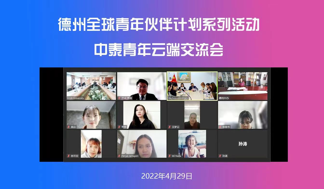 4月29日,学校在厚德楼第六会议室举行德州全球青年伙伴计划—中泰青年云端交流会。泰国格乐大学校长助理齐斌,德州市人民政府外事办公室友协专职副会长李静线上出席会议,我校国际交流合作处(国际教育学院)、外国语学院主要负责人参加了此次活动。