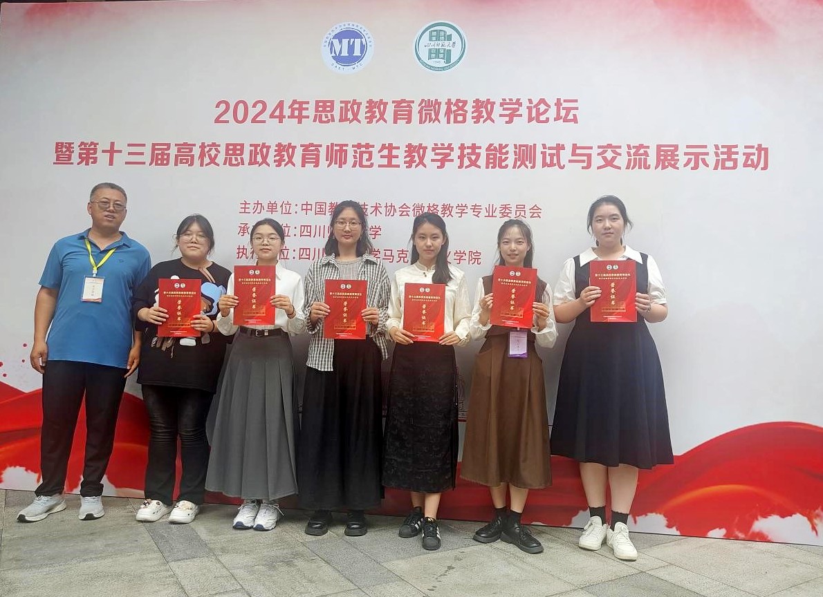 5月24日-27日,2024年思政教育微格教学论坛暨第十三届高校思政教育师范生教学技能测试与交流展示活动在四川师范大学举行,我校马克思主义学院共选拔6名选手参赛,比赛中,6位同学顽强拼搏、稳定发挥,分别获得教学技能测试等级二等1项、三等4项、优秀1项的好成绩。