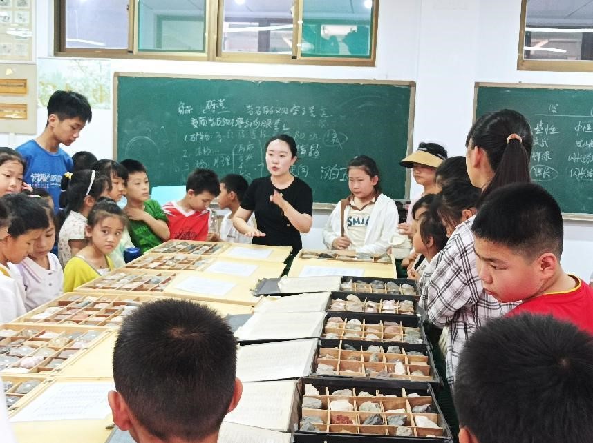 在自然资源科普基地,袁桥镇师生依次参观了人体标本室、中药标本室、动物标本室、岩石标本室、昆虫与植物标本室。参观过程中,讲解员对他们的疑惑给予耐心的解答,向小学生们讲解动植物的形态和特征。学生们认真做笔记,现场科普氛围十分浓厚。