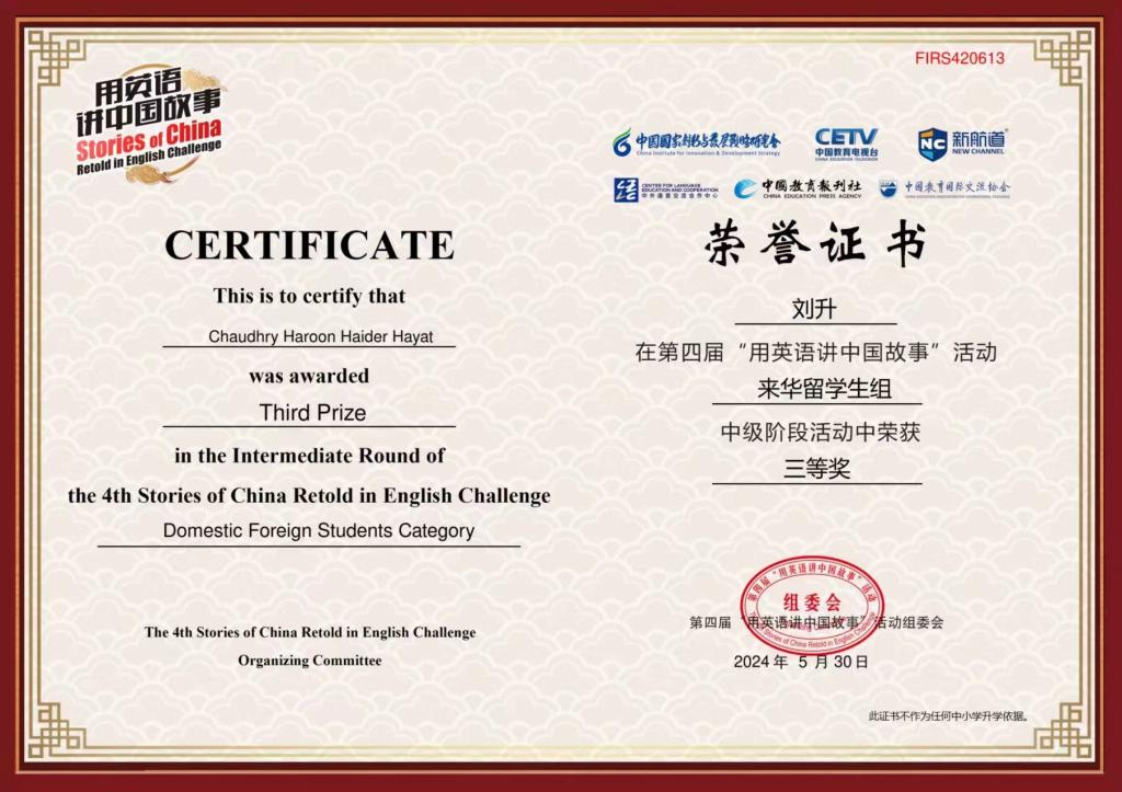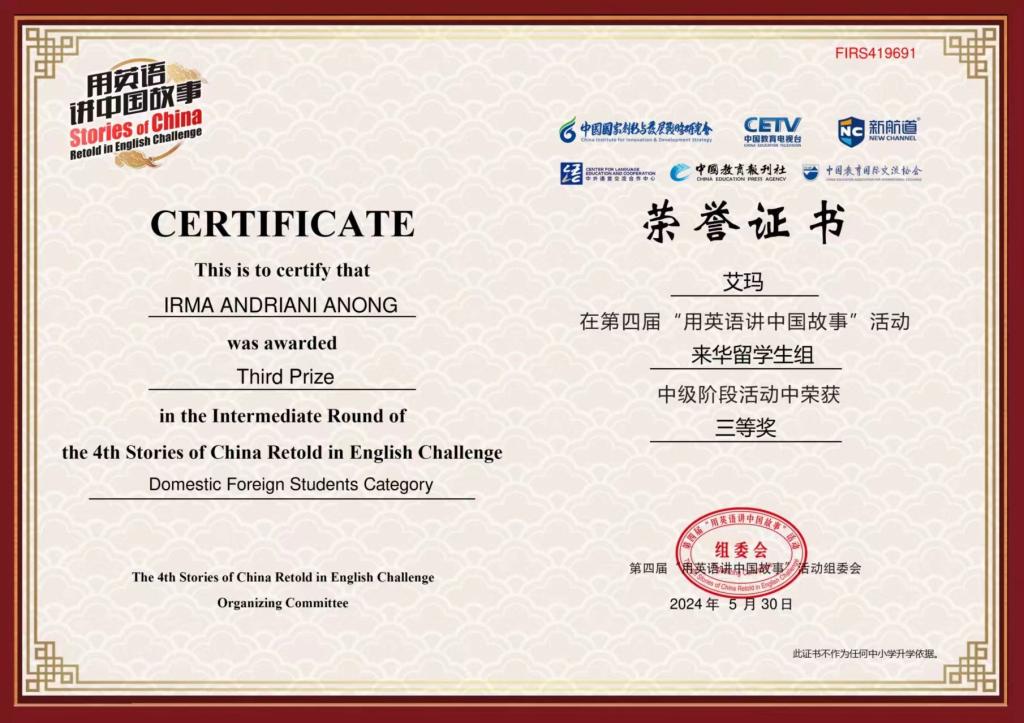 近日,我校巴基斯坦籍留学生Chaudhry Haroon Haider Hayat刘升、印度尼西亚籍留学生Irma Andriani Anong艾玛在第四届“用英语讲中国故事”活动“来华留学生组”中级阶段活动中荣获三等奖。凭借自己在华学习期间的所见所闻,刘升生动讲述了中国的技术如何让自己国家的朋友惊叹不已,艾玛则形象地表达了对陕西特色面食文化的喜爱。两位留学生凭借出色的表现,在激烈角逐中脱颖而出。