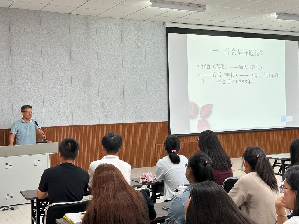 9月12日,李连伟副教授于博文楼528报告厅作“新时期普通话推广的新发展与新认识”专题讲座。他先回溯了自己与普通话结缘的历程,通过分享自己在学习普通话过程中的点滴故事,深刻阐述了推广普通话对于促进国家统一、民族团结以及社会和谐发展的关键作用。李教授指出,语言障碍往往成为沟通中的“隐形墙”,而普通话作为国家的通用语言,推普可以有效地打破地域隔阂,促进文化交流互鉴。李连伟副教授还巧妙地穿插了几个因方言差异引发的幽默小故事,让同学们在欢笑中深刻体会到了方言与普通话之间的辩证关系以及推广普通话的必要性。方言和民族语言是宝贵的文化遗产,值得我们去保护和传承,但在全球化与信息化的今天,普通话的推广更是不可或缺。同学们纷纷表示,他们更加深刻地认识到了普通话作为国家通用语言的重要意义,也更加坚定了自己学习并推广普通话的决心。