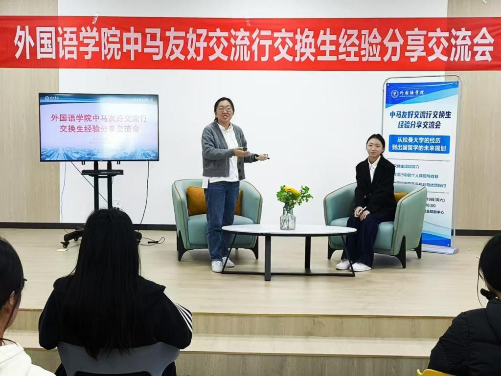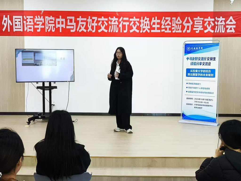 为深入贯彻落实共青团“大学生就业引航计划”,充分发挥共青团思想政治引领就业育人功能,外国语学院紧抓学生留学交流过程中关心关注的问题,10月20日,在大学生就业创业赋能中心青年会客厅举办“中马友好交流行”交换生经验分享交流会。外国语学院参加交流行的三位同学代表及70余名在校生共同参与。