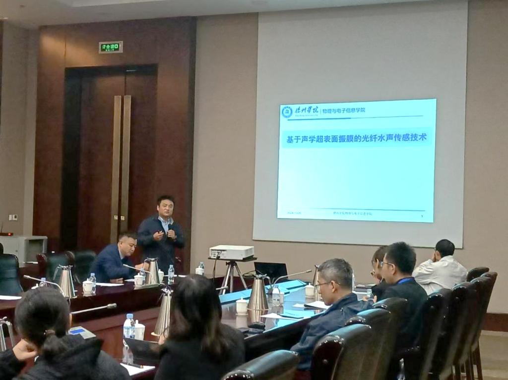 此次会议中物电学院参会教师分别在院长论坛、理论物理与光物理分会场作了院系交流以及《石墨炔的能带调控和拓扑相变研究进展》和《基于声学超表面振膜的光纤水声传感技术》的学术报告,并积极与其他单位参会代表联络探讨。
