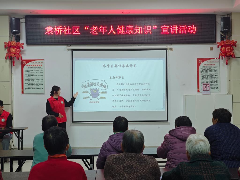 为更有效地提升居民健康认知,倡导并践行健康生活方式,增进居民生活品质,健康医学院联合袁桥社区于11月25日开展“健康相伴,岁月安然”志愿服务活动。