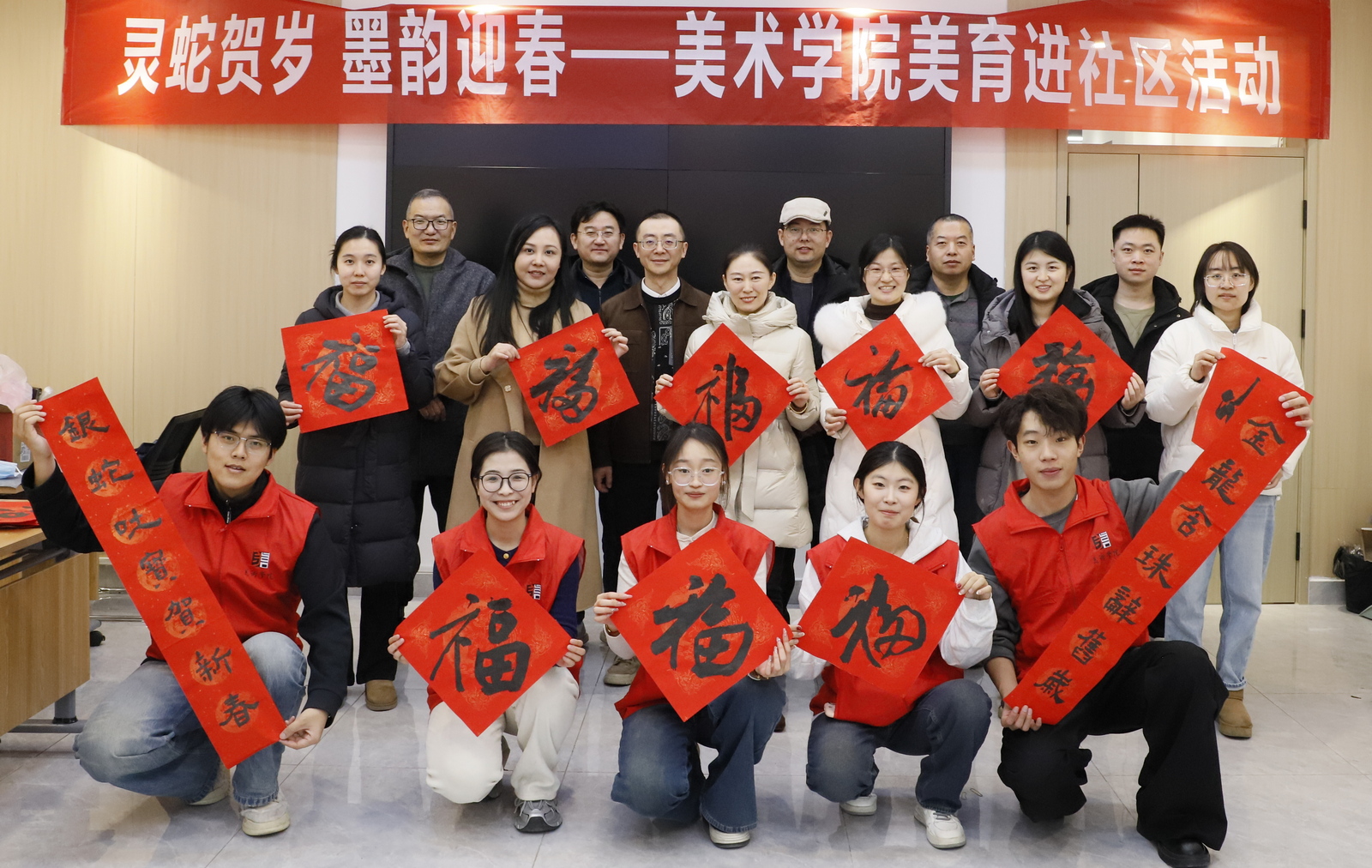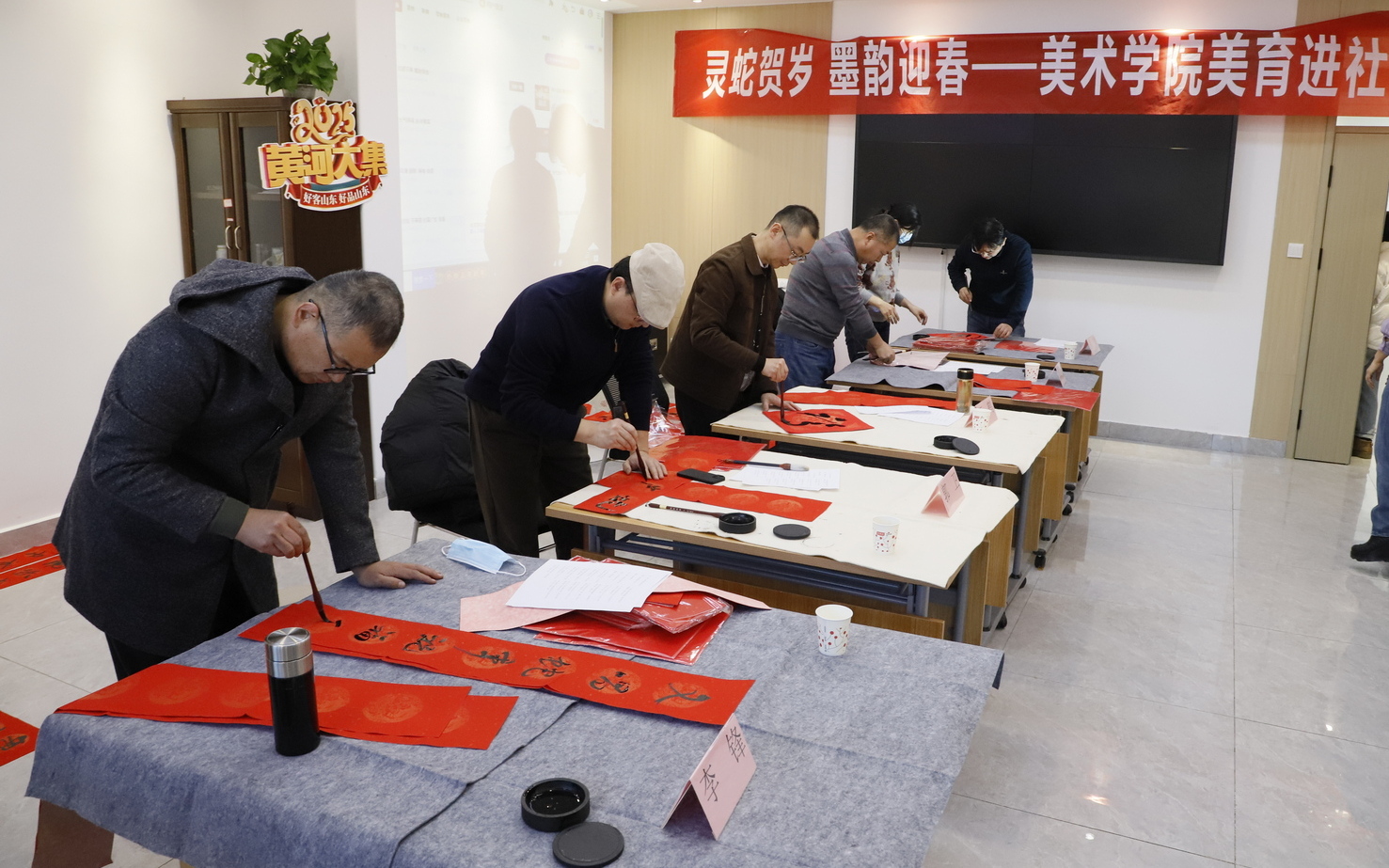千门万户曈曈日,总把新桃换旧符。为传承和弘扬中华民族优秀传统文化,营造欢乐、喜庆、祥和的春节氛围,1月8日下午,美术学院在德城区学府社区委员会会议室开展“灵蛇贺岁,墨韵迎春—美育进社区”为主题的送福送春联活动,以书写春联和“福”字为载体,将新春的祝福和美好的祝愿融入笔墨之间,为社区群众送去新春祝福。