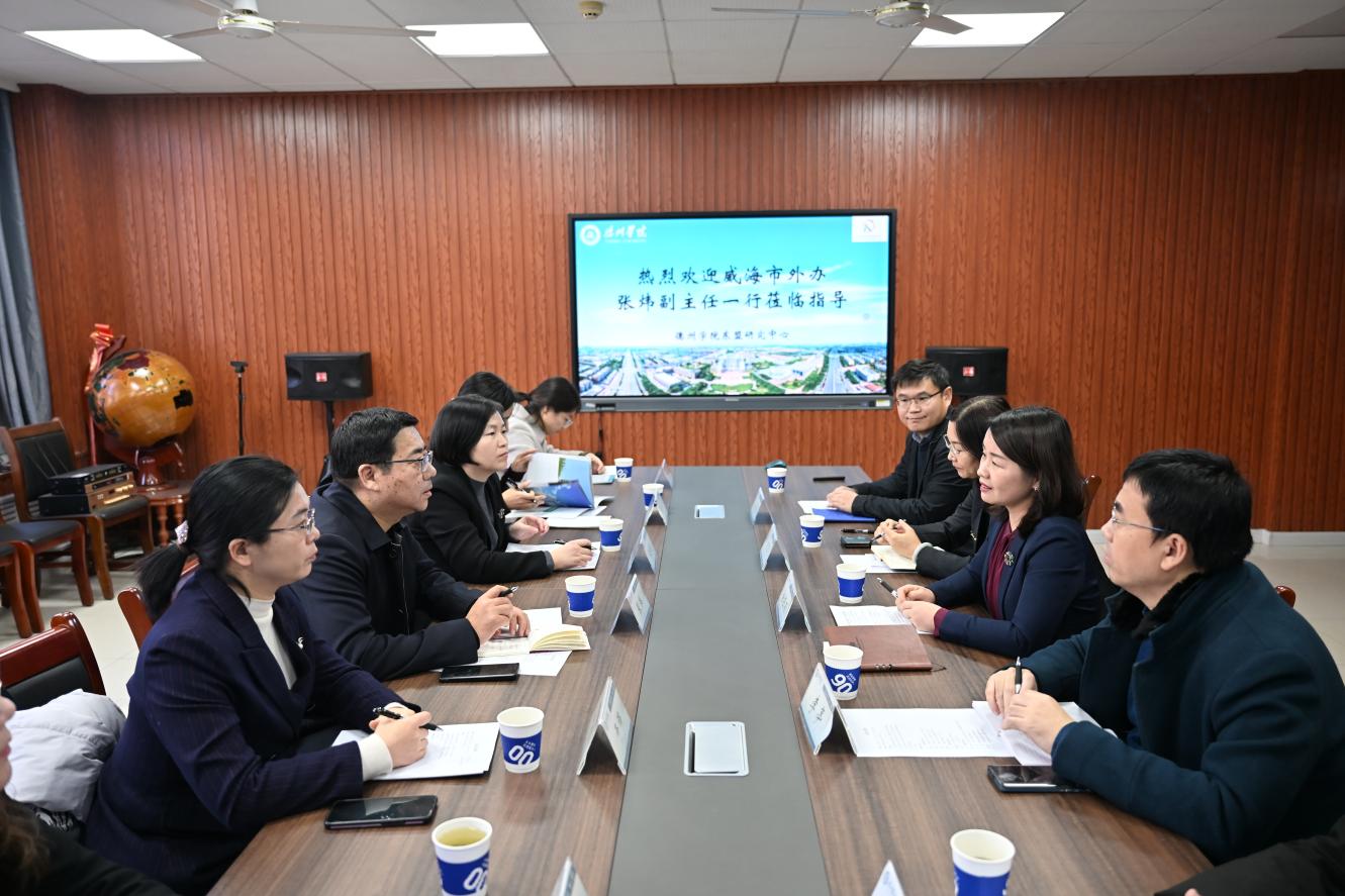 张炜简要介绍了威海市在对外交流与合作方面的经验和成果,特别是与日韩以及东盟国家之间的合作情况,希望双方在校地合作、区域国别、智库研究等方面共同探索,相互学习,实现共同发展。会前,张炜一行参观了东盟研究中心。