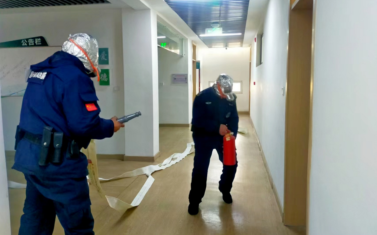 在实操培训环节进行了中控室火灾模拟操作演练,演练模拟了办公楼某办公室发生电器火灾的场景,安保工作人员迅速响应,立即启动应急预案,组织疏散组、灭火组、警戒组等各应急小组展开行动。在整个演练过程中,各应急小组分工明确、配合默契,行动迅速、有条不紊,达到了预期的效果。
