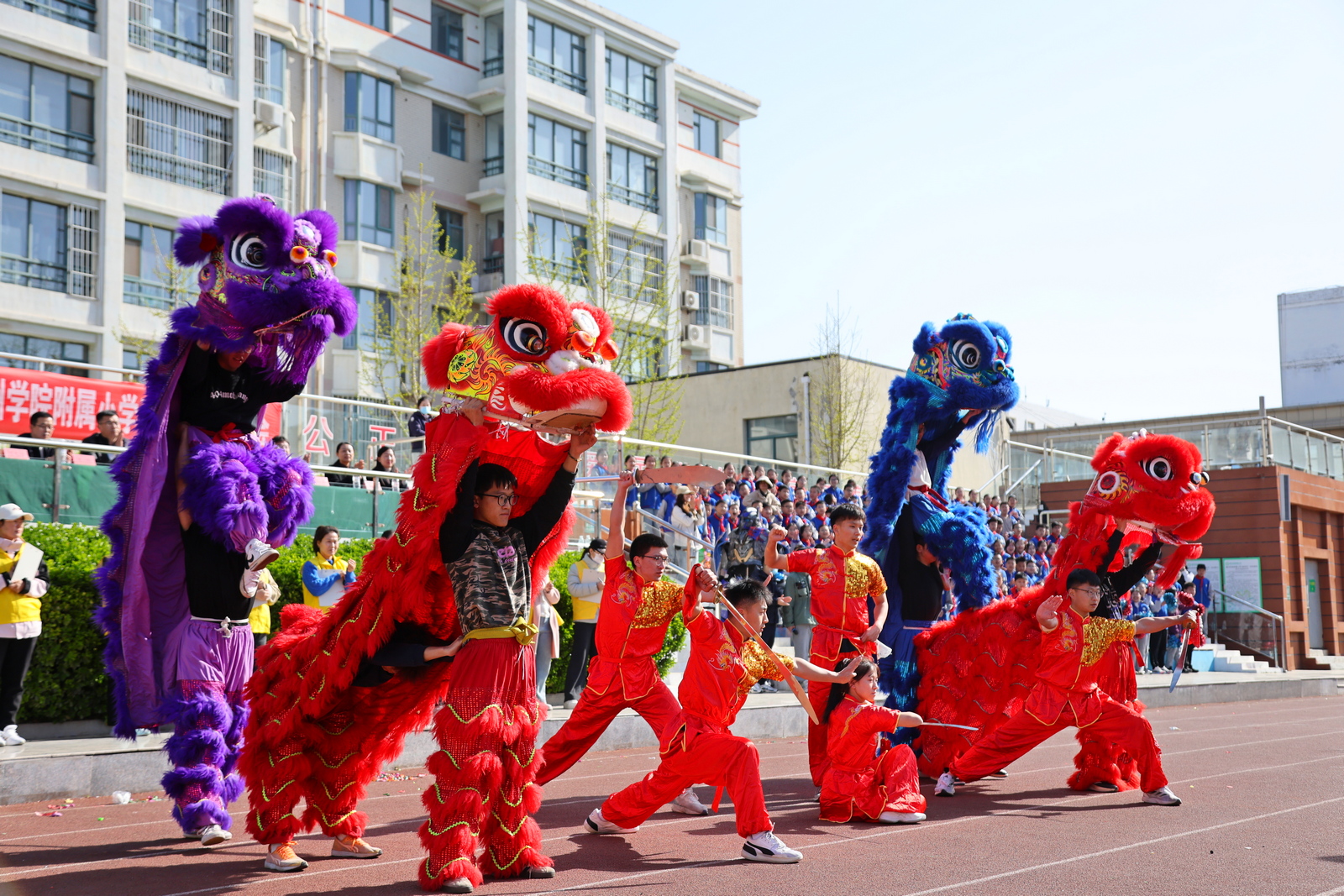 表演以“彩带龙”开场,6米长的彩绸在学生们手中化作游龙,配合音乐翻腾起舞。随后四头舞狮交替登场,大跳旋转、上肩坐头等动作引得学生们连连惊呼。武术表演环节尤为精彩,刀术方阵刀光如雪,剑术表演刚柔并济,单鞭套路虎虎生风,特别是朴刀对练和男刀表演,将传统兵器的实战技法与艺术美感完美融合。表演尾声,全体演员以武术礼仪致敬观众,小学生们自发模仿抱拳动作,现场文化传承氛围浓厚。