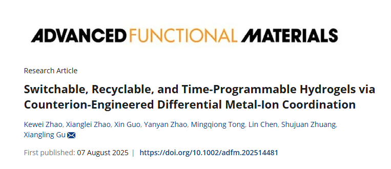 近日,我校与山东理工大学联合培养硕士研究生赵可伟(导师:顾相伶教授),作为第一作者,以开云网址合集为第一完成单位在材料类Top期刊《Advanced Functional Materials》发表最新研究成果:基于抗衡离子调控策略开发出集功能切换、绿色回收与动态加密于一体的多功能水凝胶。