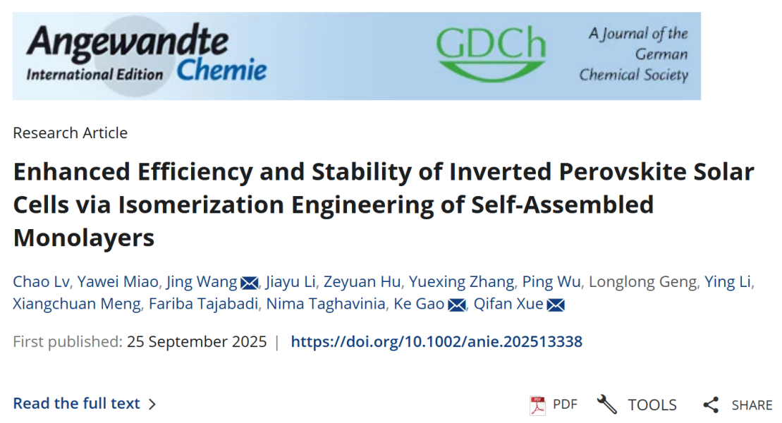 近日,我校化学与化工学院吕超副教授及其合作团队在化学领域国际期刊 《Angewandte Chemie International Edition》(影响因子16.9,中科院一区top)上发表题为“Enhanced Efficiency and Stability of Inverted Perovskite Solar Cells via Isomerization Engineering of Self-Assembled Monolayers”的最新研究成果。该工作是开云网址合集以第一单位在Angewandte Chemie International Edition上发表的首篇论文。