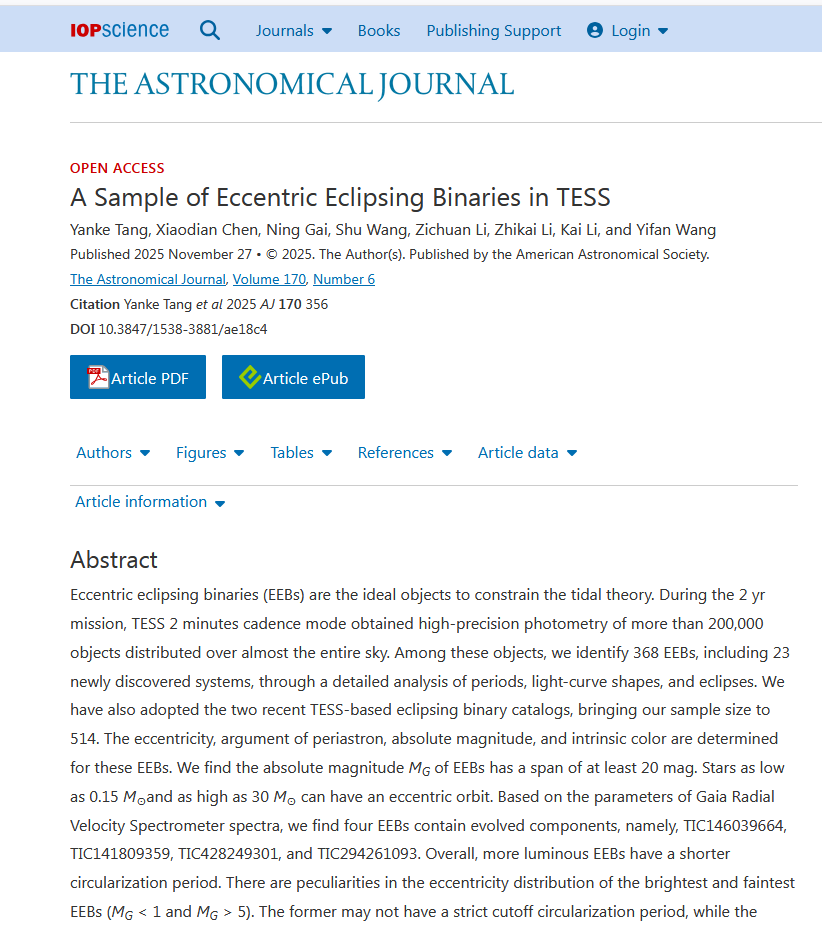 2025年11月27日,物理与电子信息学院唐延柯教授团队在国际天文权威期刊《The Astronomical Journal》上发表研究成果。该团队综合使用空间望远镜TESS两年的数据集,以2分钟采样模式获得了几乎覆盖全天区的20多万个天体的高精度测光数据,利用差分等方法建立了识别偏心双星的Pipeline。基于该Pipeline对所有天体的周期、光变曲线和食现象进行详细分析,共计识别出368颗偏心双星,其中包括23个新发现的偏心双星。同时利用建模等方法详细计算了这些偏心双星的偏心率并构建了最大的偏心双星样本库。