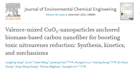 近日,山东省硅单晶单导体材料与技术重点实验室(筹)、化学化工学院耿龙龙副教授等发挥山东省青创团队学科交叉优势,与瑞典UmeåUniversity胡广志研究员和Thomas Wågberg教授合作,采用吸附辅助沉积策略,开发了一种碳纤维负载铜氧化物催化剂,并系统研究了其催化加氢特性。相关研究成果以“Valence-mixed CuOx-nanoparticles anchored biomass-based carbon nanofiber for boosting toxic nitroarenes reduction: Synthesis, kinetics, and mechanisms”为题发表在国际期刊《Journal of Environmental Chemical Engineering》(IF:7.968,中科院二区)。