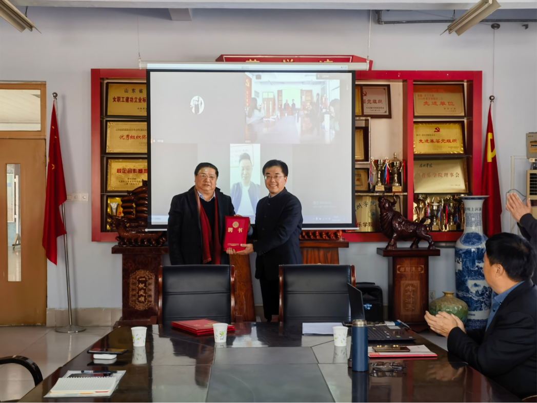 音乐学院先关负责人宣读学校聘任决定,李永平为王庆利教授颁发客座教授聘书。