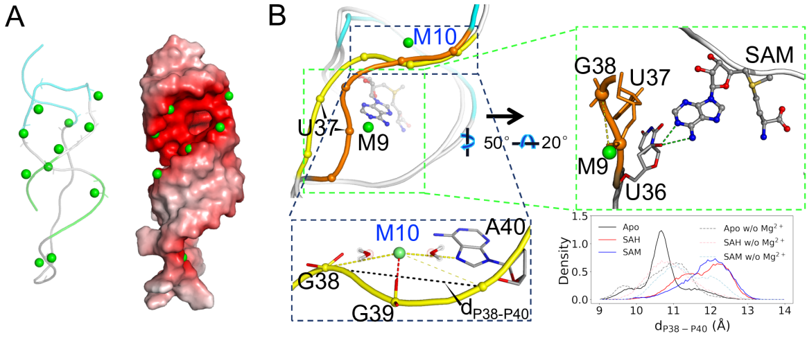 研究采用了大规模计算机模拟对模拟系统进行了总计120微秒的分子动力学模拟,预测了SAM/SAH核糖体开关中超过10个镁离子和RNA分子直接结合,其中的六个镁离子排列在小分子结合凹槽的两侧。我们的模拟给出了独特机制,特别是,小分子SAM的甲基暴露在溶剂中,导致SAM和SAH与核糖开关核苷酸的相互作用能相似,但以硫为中心的正电荷仍然有利于SAM而不是SAH。镁离子为SAH提供了补偿作用,并减弱了两种配体之间的选择性。没有甲基,一个镁离子能更好地与SAH羧基形成外壳配位,稳定U16-SAH氢键。镁离子通过静电相互作用,增加了凹槽的宽度,为小分子进入结合腔起到了预组织结合腔的作用,从而降低了进入配体结合腔的能垒。我们进一步推测,这些镁离子可能通过与配体的羧基部分的外壳配位,使配体有更多的机会进入配体结合腔。更重要的是,虽然镁离子通常被认为可以稳定包括螺旋元件在内的RNA结构,但我们对单体形式中镁离子(M10)的研究表明,它也可以特异性地与螺旋元件的一条链相互作用,并将其从互补链上剥离,从而导致SAM/SAH核糖开关最终释放SD序列。实验结果验证了我们计算结果的一些关键内容,如:MD模拟计算的RMSF曲线与实验对应的曲线数据吻合。总之,镁离子在SAM/SAH核糖开关发挥功能的过程中起着至关重要的作用,本研究将有利于相关核酸类抗菌药物的设计。