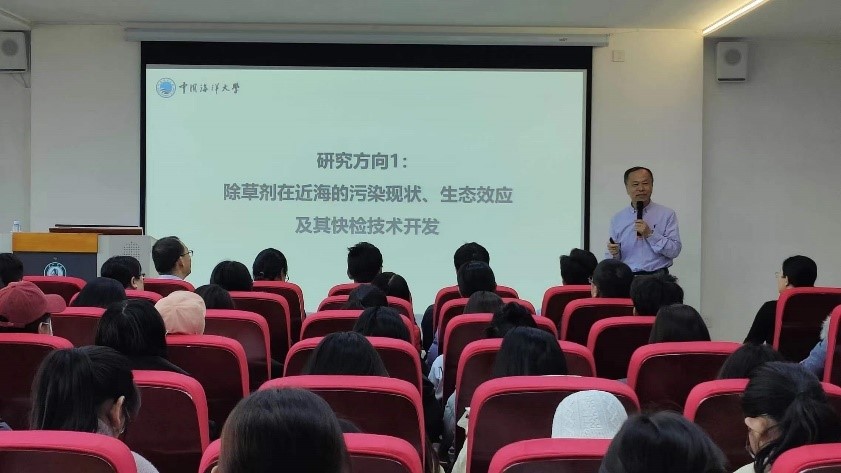 汝少国教授向与会者介绍了近年来课题组的主攻科研方向,并以“除草剂在近海的污染现状、生态效应及其快检技术开发”这一研究方向为题,引出后续内容。在报告中,向与会师生详细介绍了除草剂、双酚S等污染物对海洋生态环境造成的危害,并论述了污染物快检技术开发的重要性。其次,在报告中穿插着国家自然科学基金申报书的相关写作经验和技巧,青年教师受益良多。最后,汝少国教授详细回答了在场师生的提问。