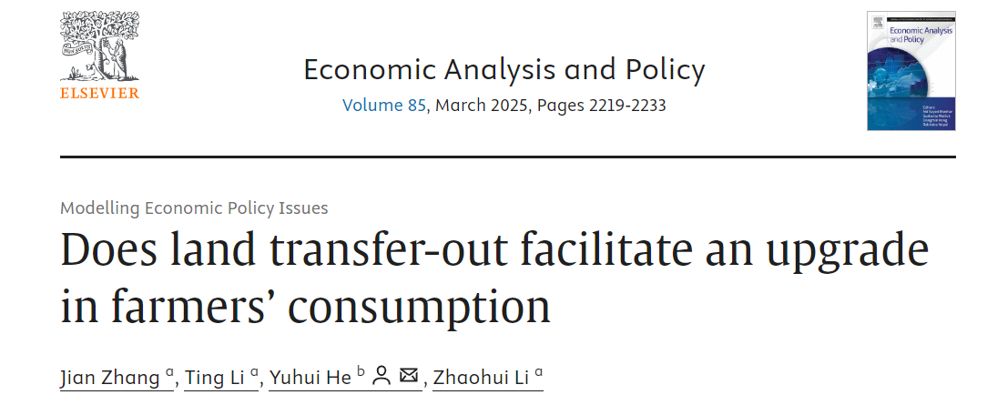 近日,我校商学院经济实验与智能商务管理团队在国际经济学知名期刊《Economic Analysis and Policy》(IF 7.9,中科院二区)上发表学术论文“ Does Land Transfer-out Facilitate An Upgrade In Farmers' Consumption ”。论文第一作者为张建博士,我校李亭教授、李朝辉教授为共同完成人,第一署名单位为开云网址合集,研究得到济南土地储备中心何宇晖研究员的指导,并作为该文的共同通讯作者。