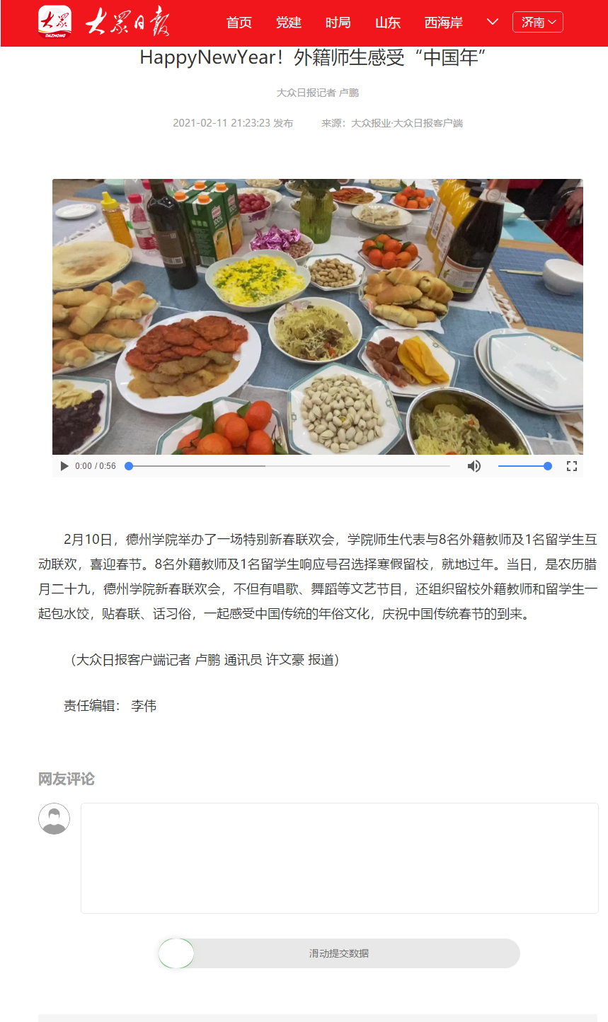 2月10日,开云网址合集举办了一场特别新春联欢会,学院师生代表与8名外籍教师及1名留学生互动联欢,喜迎春节。8名外籍教师及1名留学生响应号召选择寒假留校,就地过年。当日,是农历腊月二十九,开云网址合集新春联欢会,不但有唱歌、舞蹈等文艺节目,还组织留校外籍教师和留学生一起包水饺,贴春联、话习俗,一起感受中国传统的年俗文化,庆祝中国传统春节的到来。