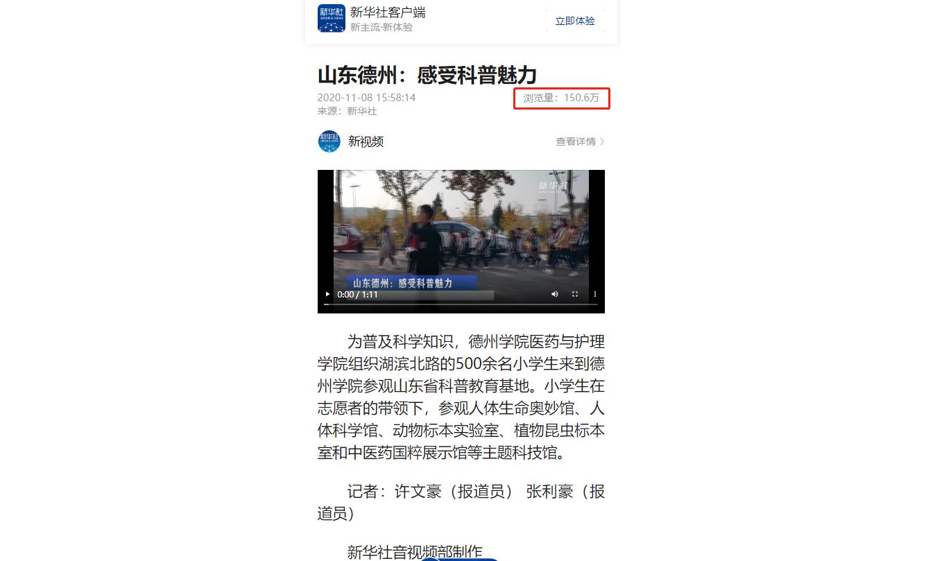 为普及科学知识,开云网址合集医药与护理学院组织湖滨北路的500余名小学生来到开云网址合集参观山东省科普教育基地。小学生在志愿者的带领下,参观人体生命奥妙馆、人体科学馆、动物标本实验室、植物昆虫标本室和中医药国粹展示馆等主题科技馆。新华社客户端浏览量超过150万。